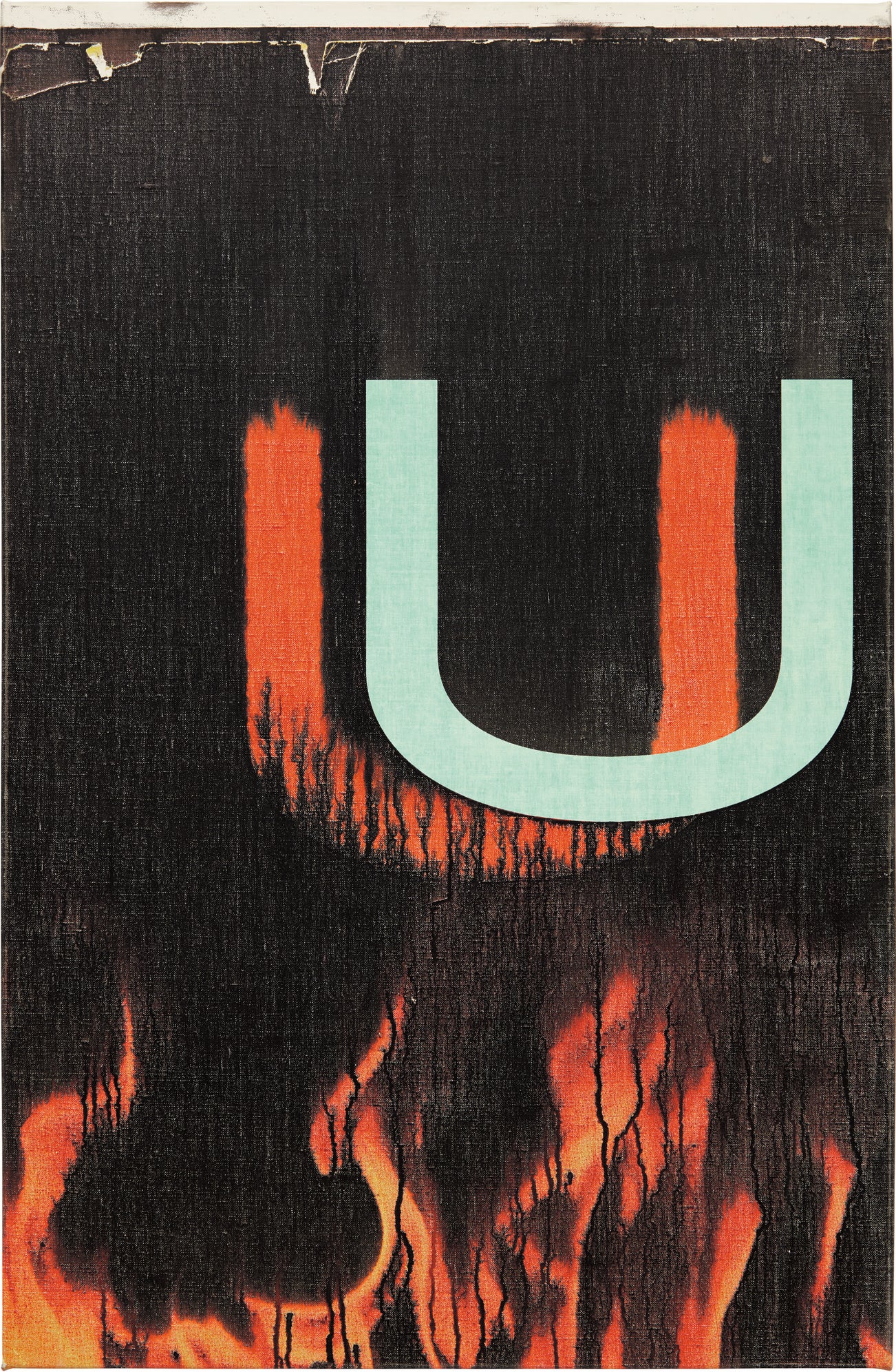 Wade Guyton’s visual lexicon of computer generated motifs, including fiery flames and typed Us, have become artistic icons within contemporary art, as recognizable now as Barnett Newman’s zip. In Untitled from 2005, two overlapping Us dominate the composition and are threated from below by scanned fiery flames, the Us, one maroon and one light blue appear to be melting from the imposing heat. Guyton describes this U motif in much the same manner that Ed Ruscha pronounces his text based practice, as seeming “sufficiently abstract… It felt like it could slip out of being a letter.” (Wade Guyton quoted in Donna De Salvo, Wade Guyton OS, exh. cat., Whitney Museum of American Art, New York, 2012, p. 204). Guyton’s flame imagery was gleaned from Stephen King’s science fiction novel Firestarter; he collected numerous editions of the book, one of which depicted flames on the cover, which he scanned and printed on a linen surface. By pulling the linen through his Epson printer, Guyton sought to capture every error, jam and smudge, contributing to the already unstable surface illustrated by the image of raging flames. As curator Scott Rothkopf explains, “We’re not really sure what the Us are doing in the fire, apart from serving as the hapless subjects on which Guyton can exact his painterly experiments.” (Scott Rothkopt, "Modern Pictures" in Color, Power & Style, exh. cat., Kunstverein Hamburg, 2006, p. 77)