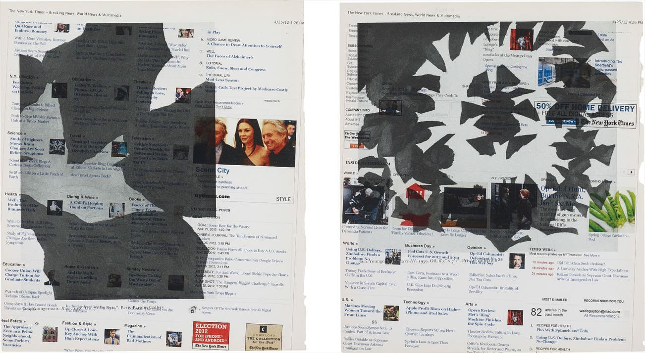 Two works: (i) Untitled (The New York Times – Breaking News, World New and Multimedia 4/25/12 4:26 PM. Quit Race and Endorse Romney); (ii) Untitled (The New York Times – Breaking News, World New and Multimedia 4/25/12 4:26 PM. Pho with Spinach and Tofu)