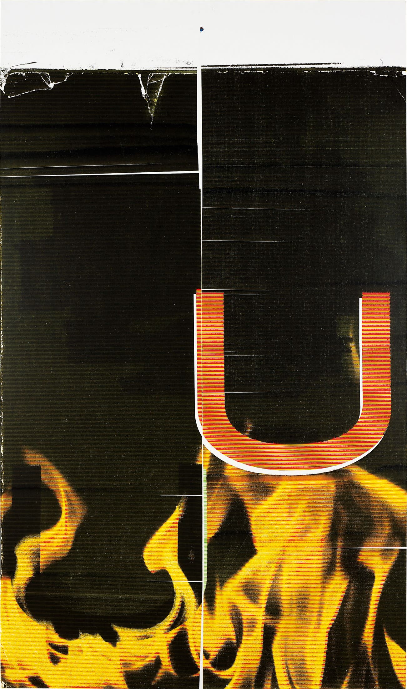 The flame motif that defines the fire paintings stems from the artist’s earlier paper printing phase, and was originally torn from an old book cover. Guyton’s revival of this image stems from his desire to inject an element of pictorial content back into his increasingly abstract practice. Combined with the hazy drippings and blurred effects of his new printing method, the resulting paintings brought the flames to life in ways unimagined by the artist. Guyton counteracts this figurative embodiment with his deliberately abstract lettering. In contrast to his use of the letter “X”, which has frequently been interpreted in symbolic terms, the letter “U” “seemed sufficiently abstract… It felt like it could slip out of being a letter.” (W. Guyton, quoted in interview with D. De Salvo, in Wade Guyton OS, exh. cat., Whitney Museum of American Art, New York, 2012, p. 204). This deliberate evasion of meaning foregrounds the visual quality of the letter, which appears to glow and combust beneath the red-hot flames.