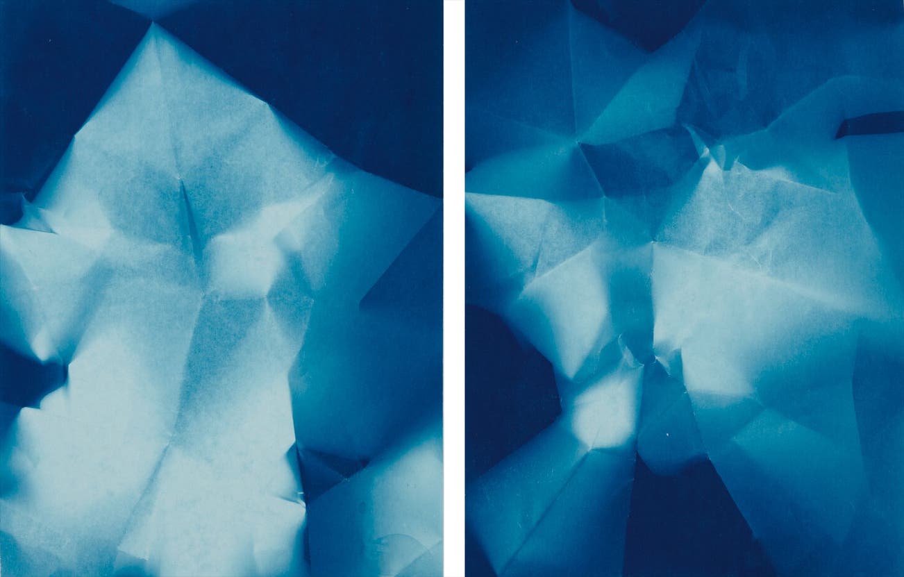Two cyanotypes with unique folds, on lightweight wove paper, the full sheets, both with the accompanying Certificates of Authenticity.