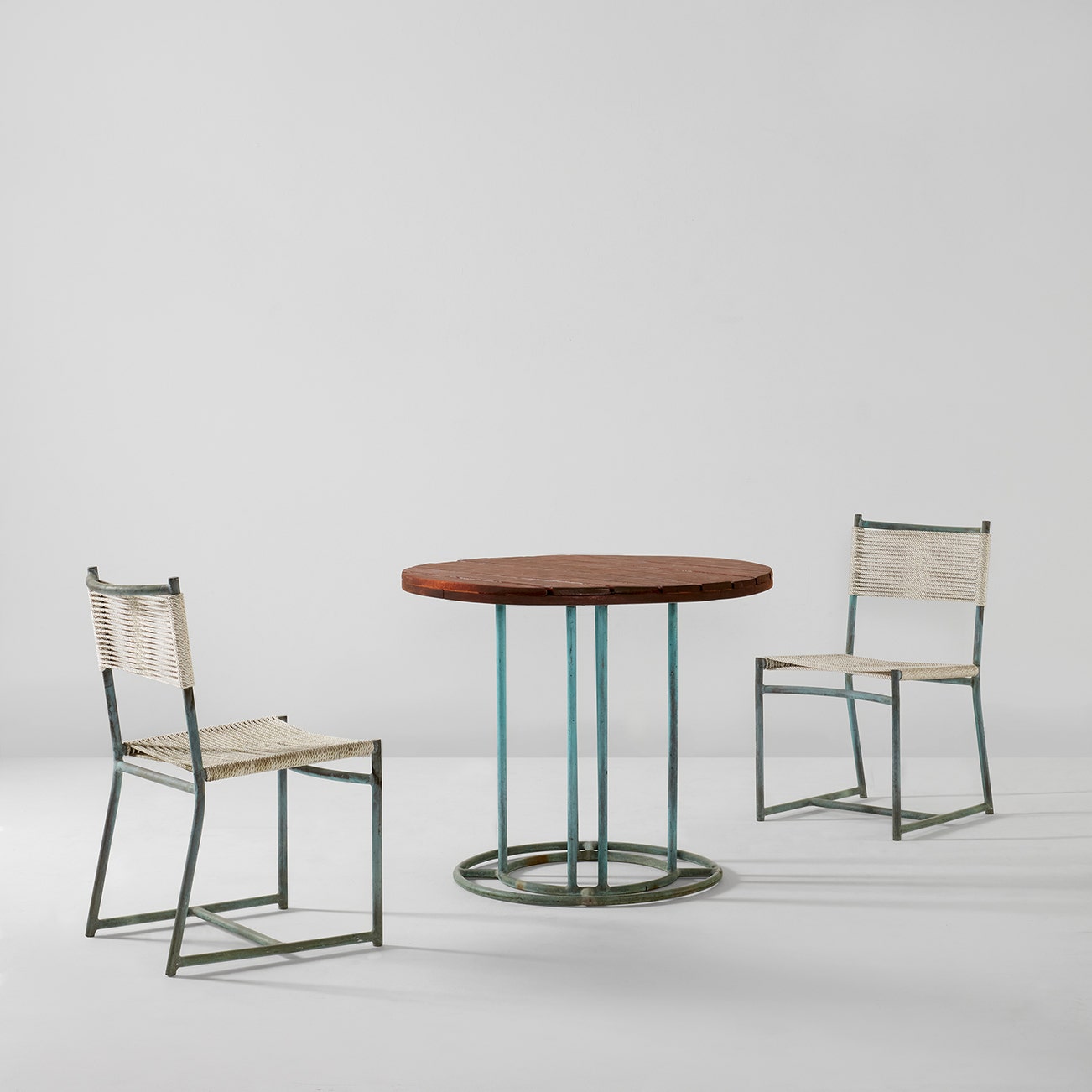 Manufactured by Walter Lamb, Honolulu, Hawaii. One table leg and one seat frame with label printed Designed & Mfd by/WALTER LAMB/Honolulu. Hawaii.