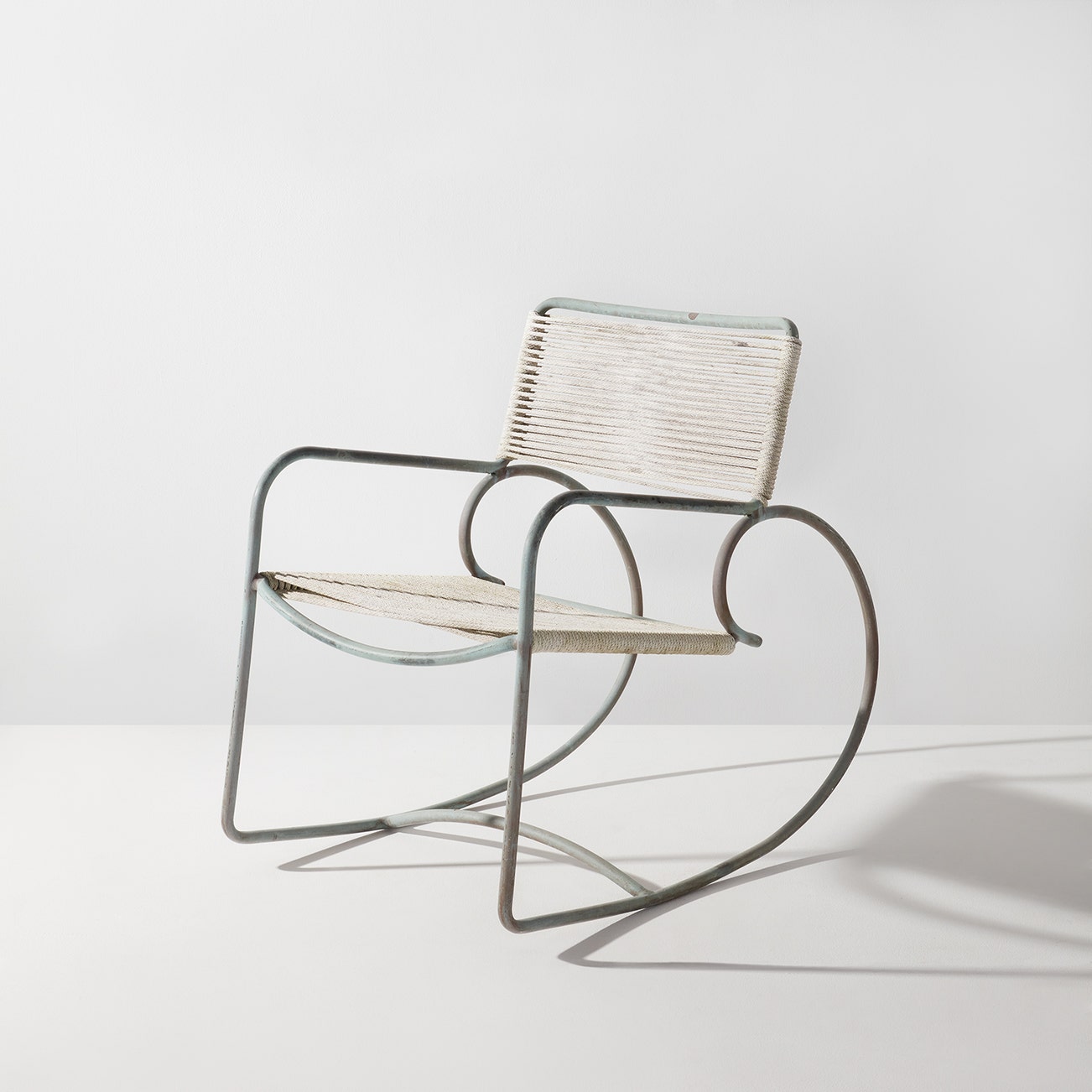 Manufactured by Brown-Jordan, Pasadena, California. Seat frame with manufacturer's metal label printed Brown Jordan, partially obscured.