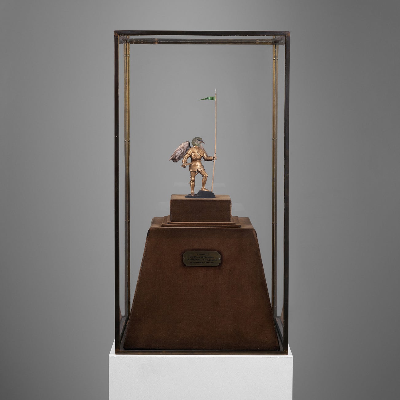 plastic figurine, taxidermied bird, paint, wood and velvet in a Plexiglas vitrine