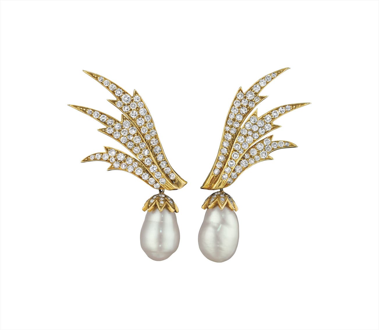 Each suspending a baroque cultured pearl from a circular-cut diamond cap, from a stylized foliate surmount entirely set with circular-cut diamonds, mounted in 18K yellow and white gold, length 2 1/2 inches, pendant is detachable.