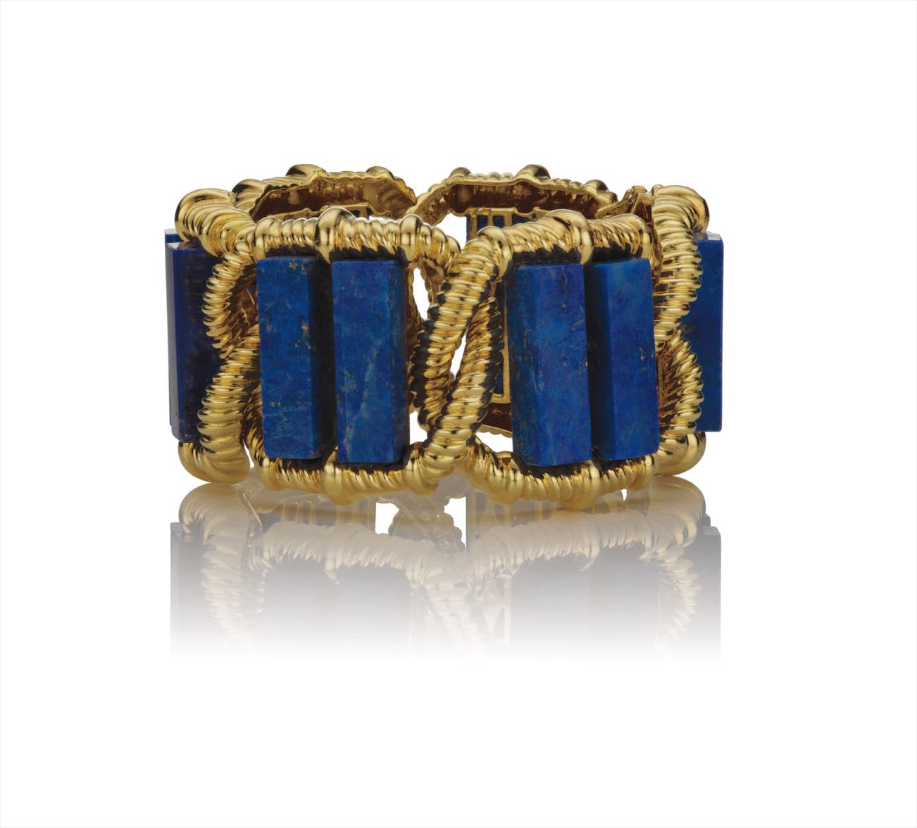 Designed as a series of rope-twist gold links, each set with two carved lapis lazuli batons, mounted in 18K yellow gold, diameter 2 1/4 inches.