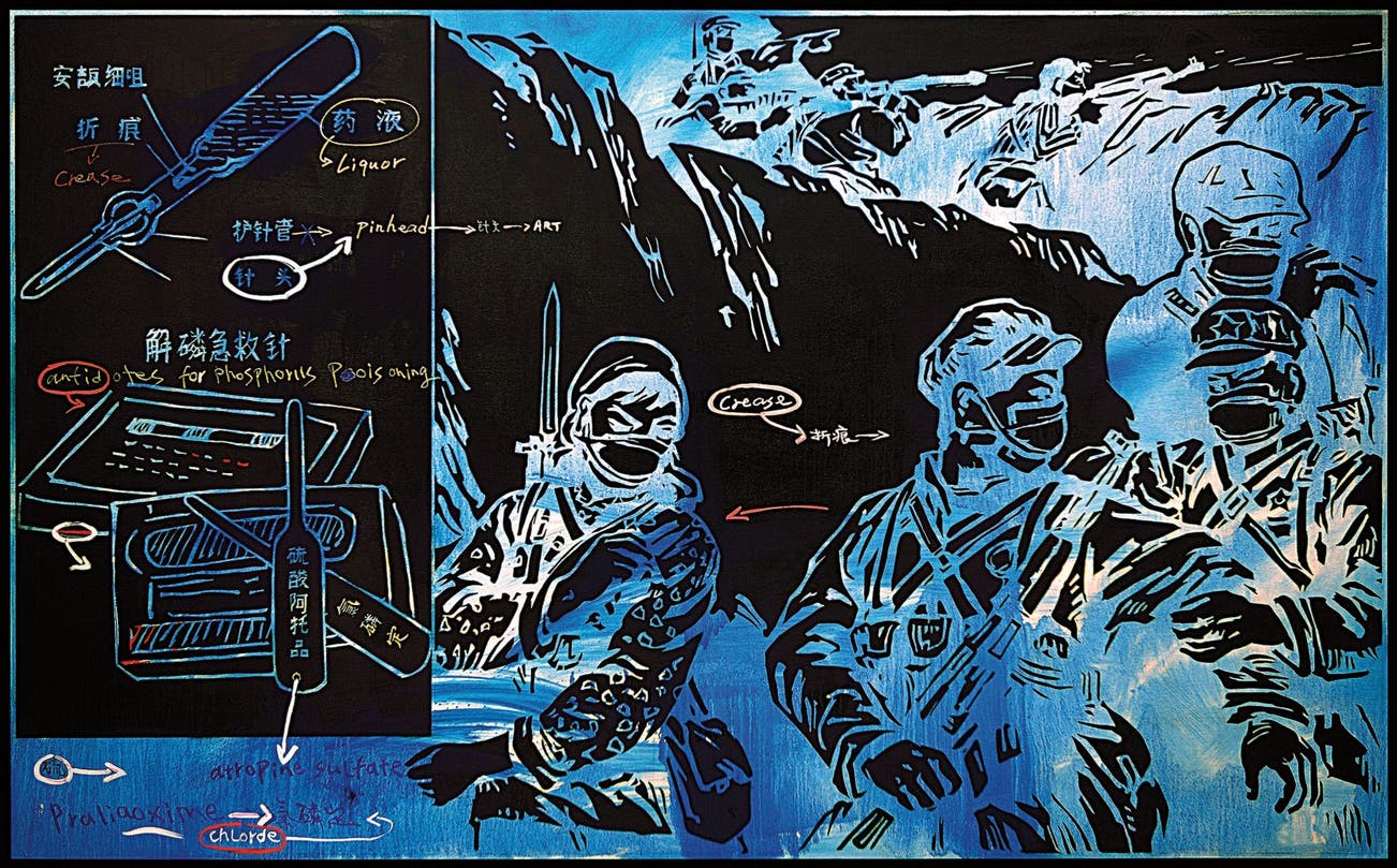 Guangyi’s Aesthetics of War - Blue No. 3 operates as a dual narrative. Combining the graphic styles of comic books and instructional manuals with scrawled blackboard-like text his work points to a visual analysis that’s equally personal and pedagogical. Rendered in X-ray tones, his tableau is situated in the realm of science fiction and adventure, giving a sense of toxicity and danger to the pop motifs and generic script, questioning the implications of public images as coded messages and the tacit role of the artist as producer.