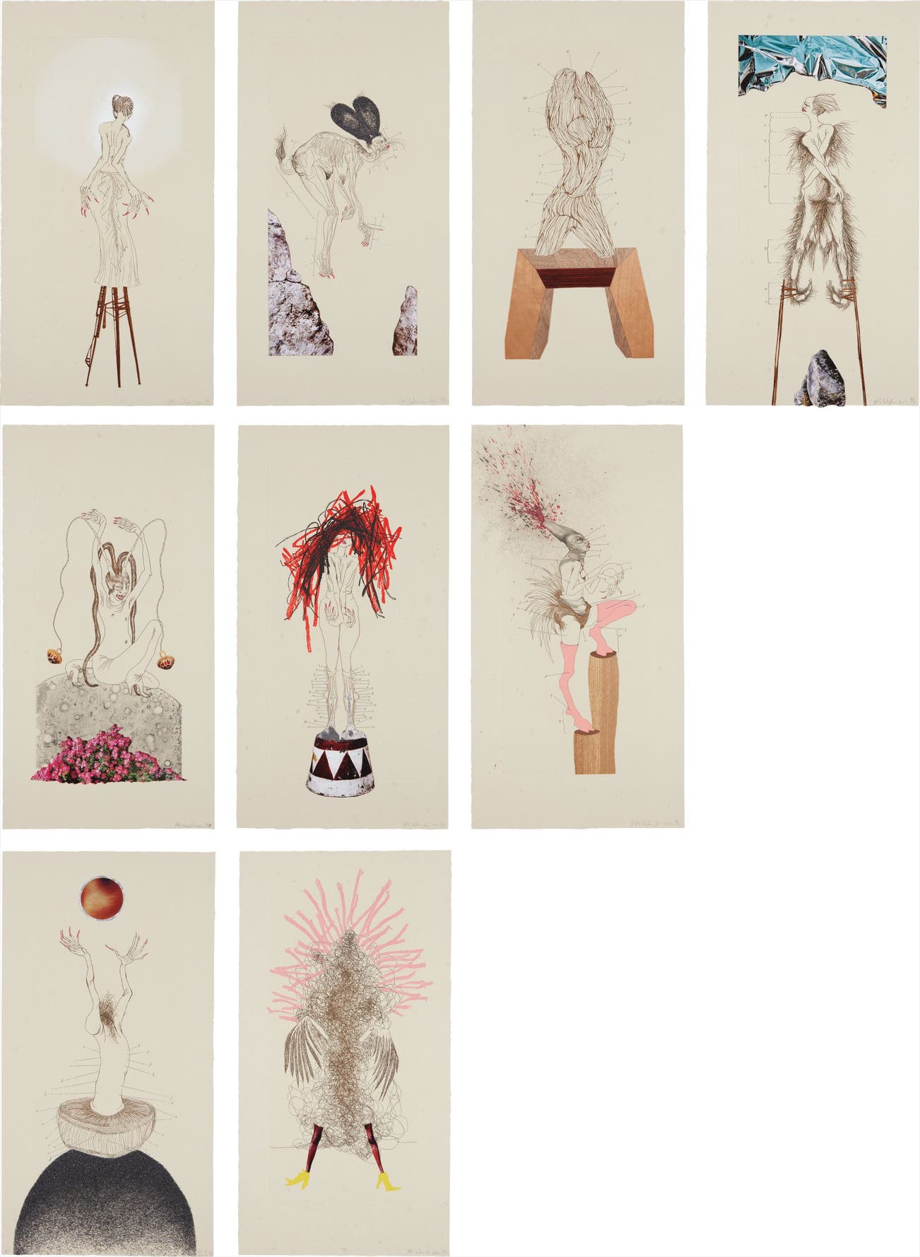 The Nine Daughters are part of the Kenyan creation myth, our Adam and Eve. The nine original tribes and clans come from there. They are all freakish poetic hybrids, not literal. Some prints make connections between Renaissance and Victorian etchings, but they are all esoteric. None of the scientific information is accurate. They also have pins in the body as markers of body parts and body types, which recur in my work. Wangechi Mutu
