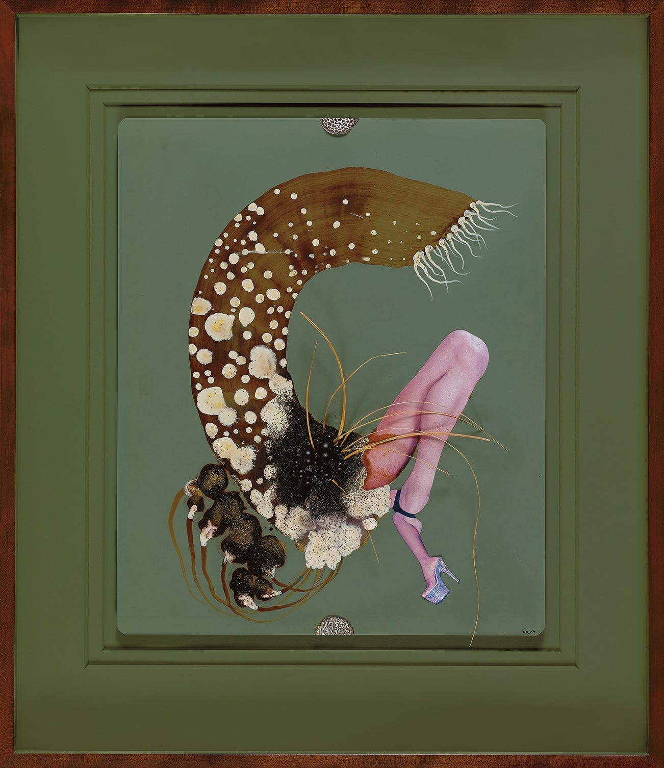 ink, paint, mixed media, plant material and plastic pearls on X-ray paper, in artist's frame