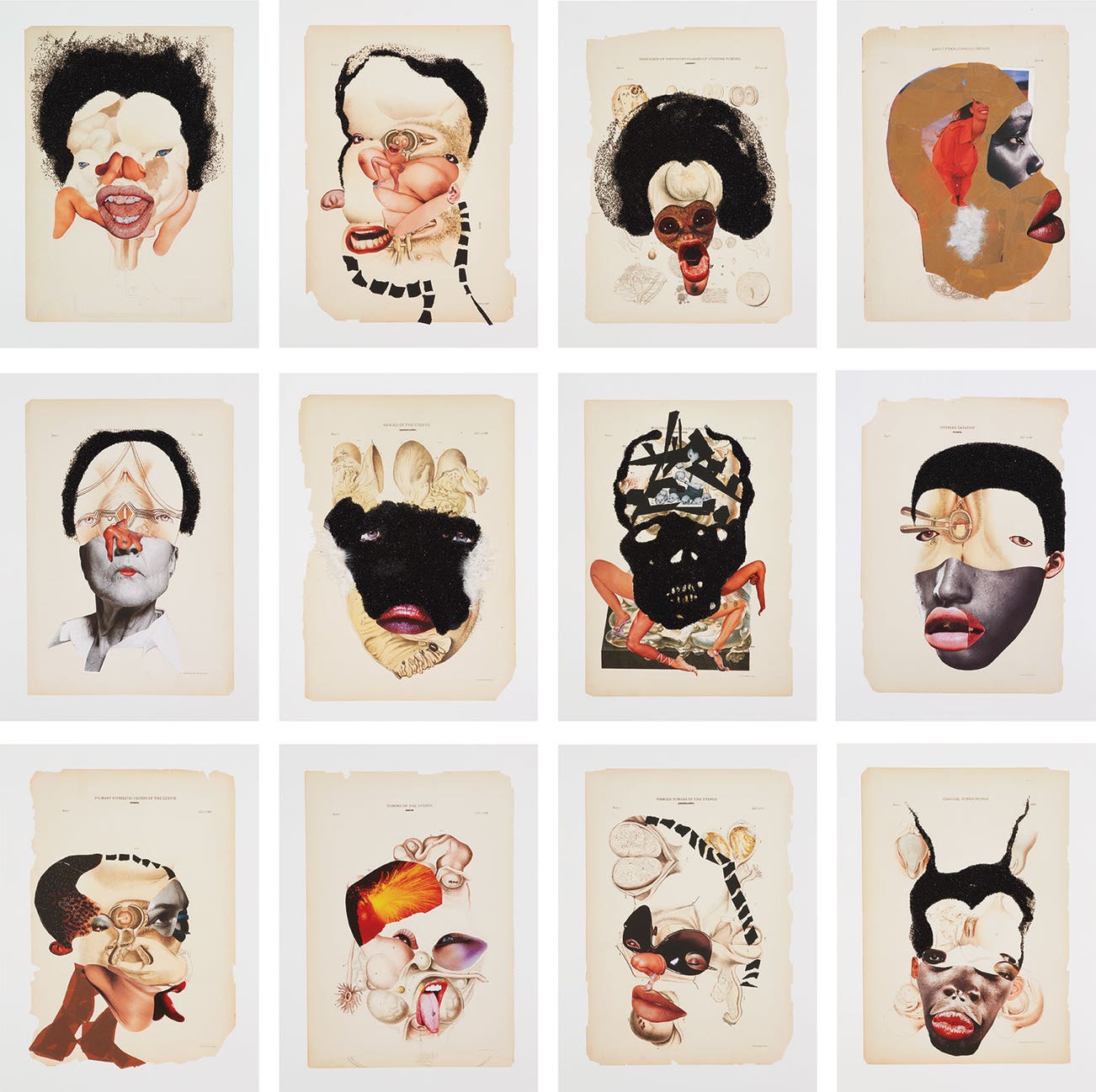 The complete set of 12 digital prints in colors with mixed media collage including hand-applied fur and glitter, on Epson Premium glossy photo paper, with full margins.
