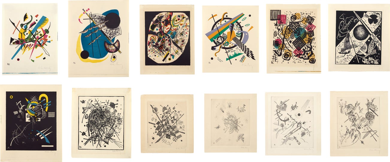 Introduced in the 19th century, the German term Gesamtkunstwerk or 'total work of art', expressed the need for a synthesis within the arts, the creation of a more comprehensive work. Kandinsky saw this 'combined art' as beneficial to the spirit, “every man who steeps himself in the spiritual possibilities of this [total work of art] is a valuable helper in the building of the spiritual pyramid which will someday reach to heaven," said Kandinsky. He believed that the only way to create works that would be truly monumental was by considering the total work. In Kandinsky’s oeuvre of printmaking, Kleine Welten (Little Worlds) is monumental and is an incarnation of the spiritual.
