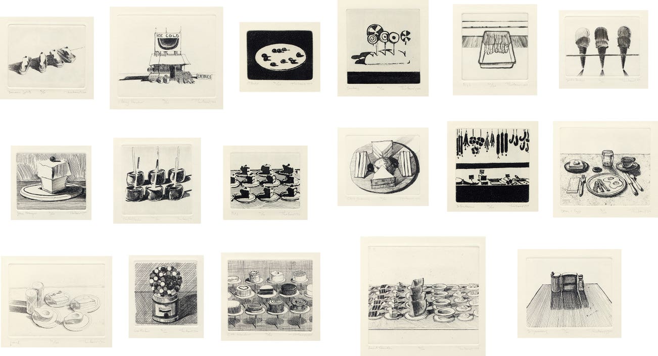 Thiebaud created the seventeen etchings for Delights to handsomely document and enhance the appreciation of our existence. “We are hesitant to make our own life special ... set our still lifes aside,” wrote Thiebaud in Is a Lollipop Tree Worth Painting, San Francisco Chronicle, 1962. “If we sentimentalize or adopt a posture more polite than our own,” he continued, “we are not having a real look at ourselves for what we are.”