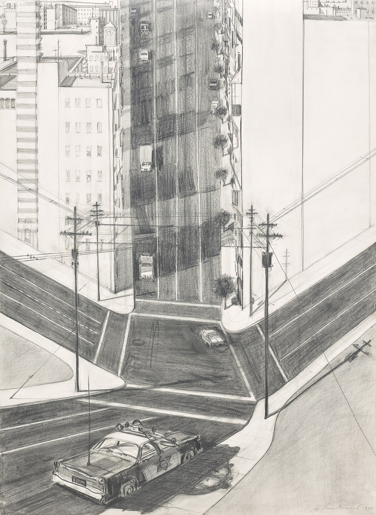 signed and dated “♥ Thiebaud 1977” lower right; inscribed “Intersection and Police Car #33” on the reverse