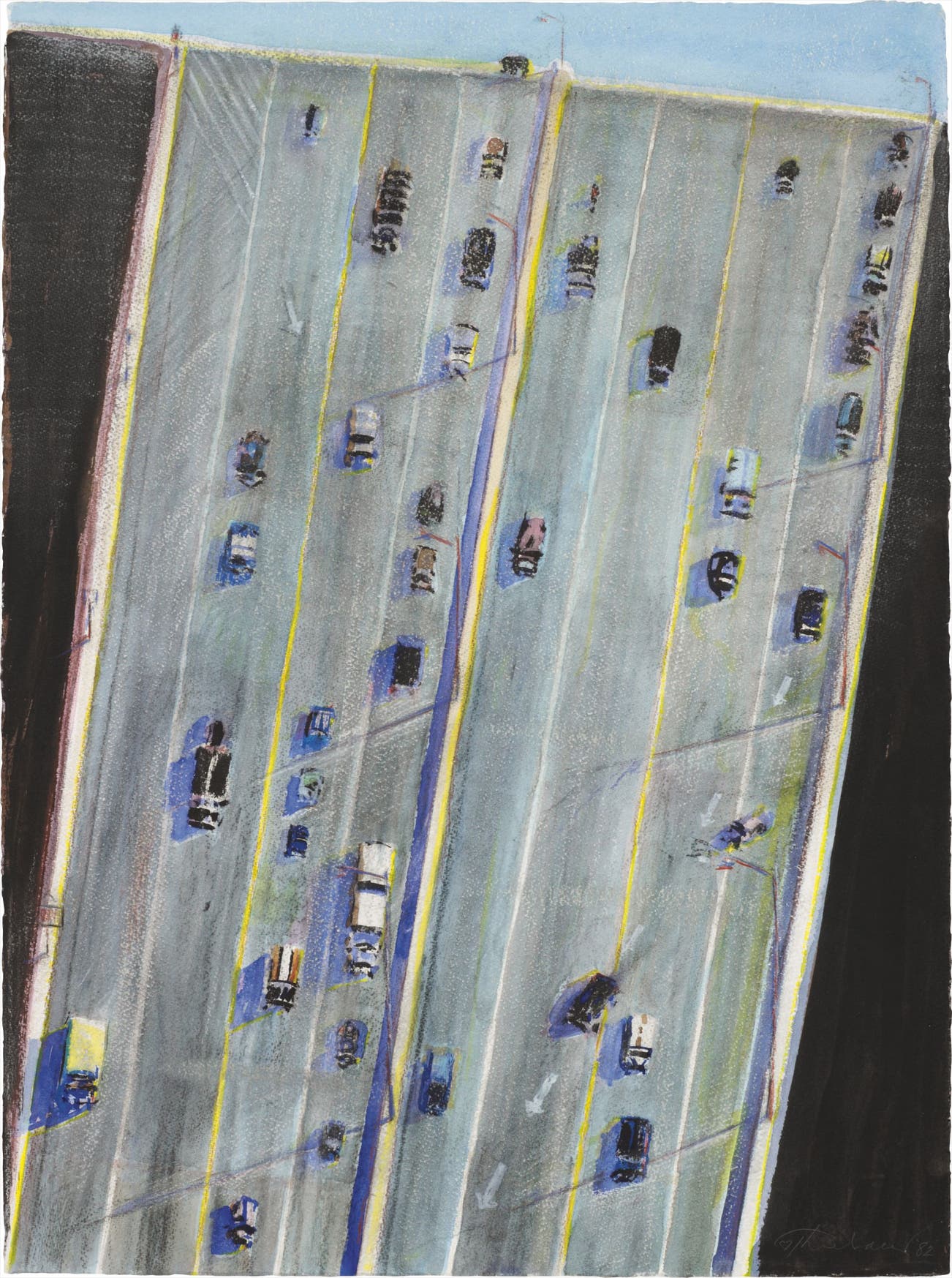 Eight lanes of traffic diagonally divide the composition, framed by two thick bands of black paint and a clear blue skyline delineating the horizon along the upper edge of the sheet. Vehicles appear to plunge down the surface, a cascade of miniature machines over a cement waterfall. Each vehicle casts a small shadow over the concrete as it accelerates towards the lower edge of the composition. Cleverly using the flat surface of the page and the vertical nature of its presentation, the artist triumphantly emphasizes the character of his beloved city to astonishing degrees. While shifting away from serial repetition of Pop imagery, Thiebaud’s urban landscape results in a studied exploration of the juxtaposition between city life and nature—a celebration of the built environment and the very conventions of landscape painting.