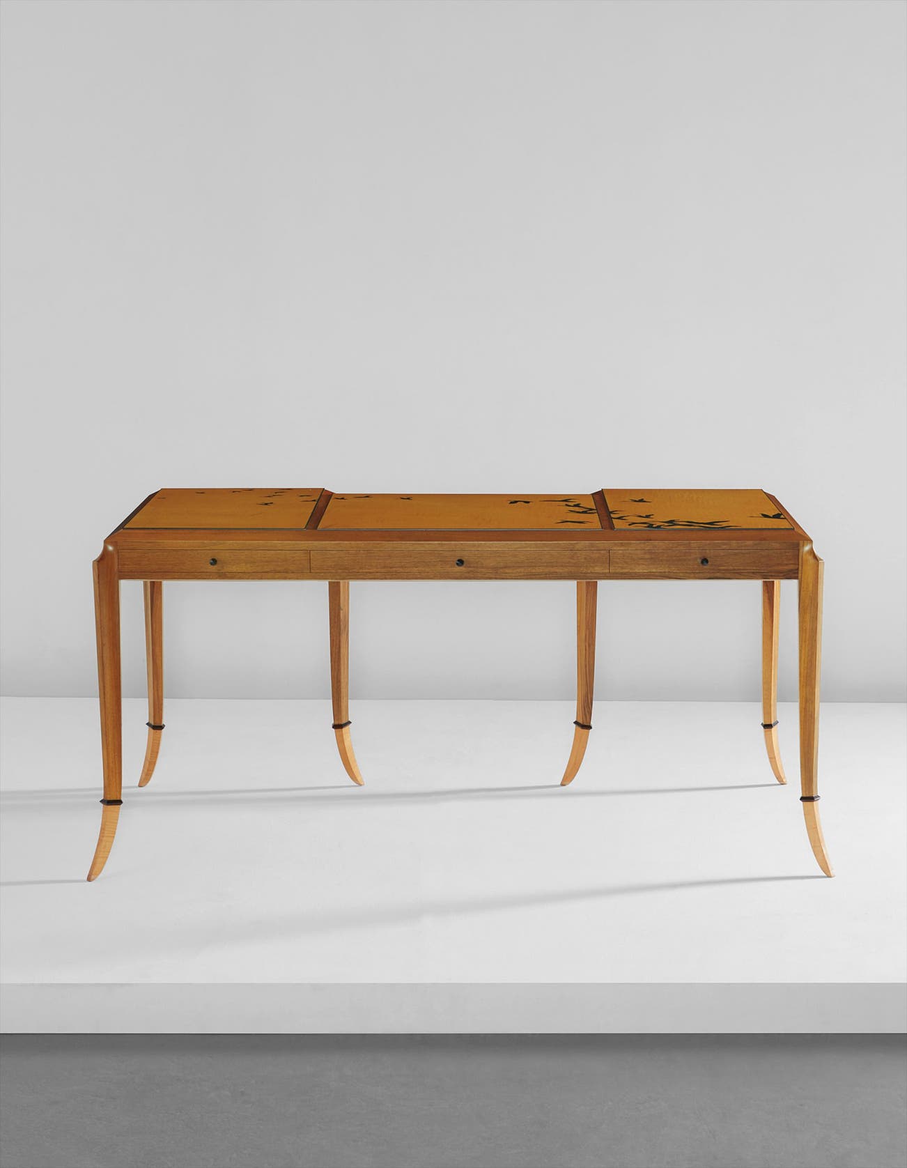 English walnut, curly maple, ebony, lacquer, India ink.