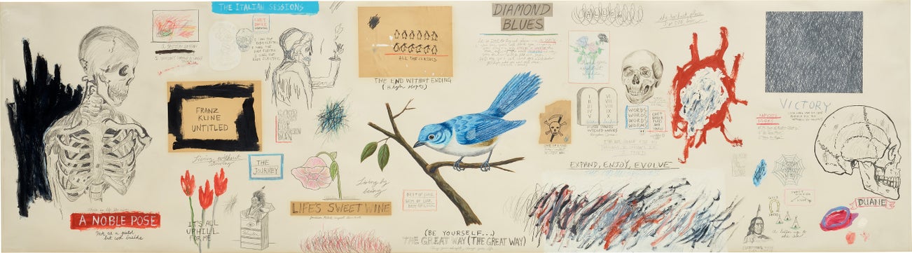 oil, graphite, coloured pencil, watercolour, oil stick and paper collage on paper
