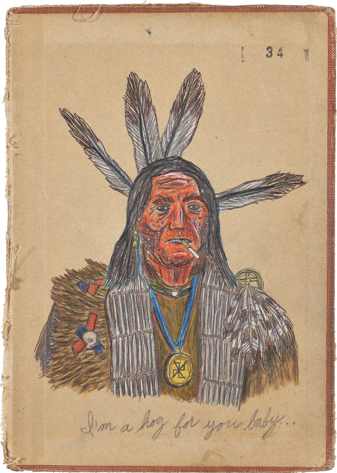 Unique colored pencil, ink and graphite drawing, on found book cover.