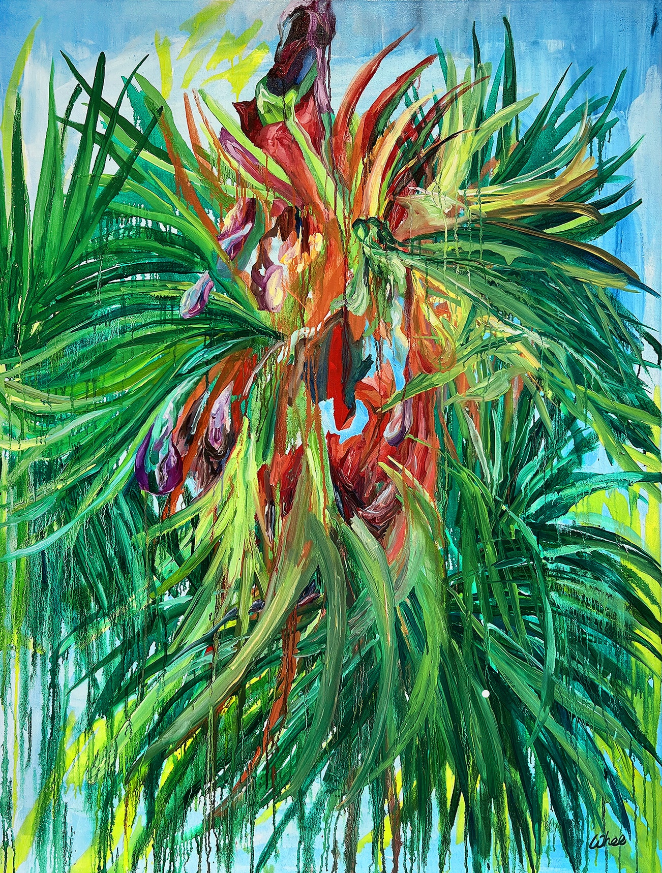 Drawn by the abundant tropical green nature of the Philippines, Whee Delgado relates not only to the existence of lush green plants emitting the energy of life, but also being a lot like us; they are in fact a portrait of us. In Whee’s work, the concept of desire has always been an important element, and with the subject of tropical plants, Whee captures the vibrant, invigorating, visceral and sensual aspect of nature. Employing quick, dynamic, gestural brushstrokes, sometimes with controlled precise movement, the works convey the energy of living, creating, communicating and procreating through vivid colours like the plants manifesting their radiating life through luscious fruits and stunning colourful flowers.