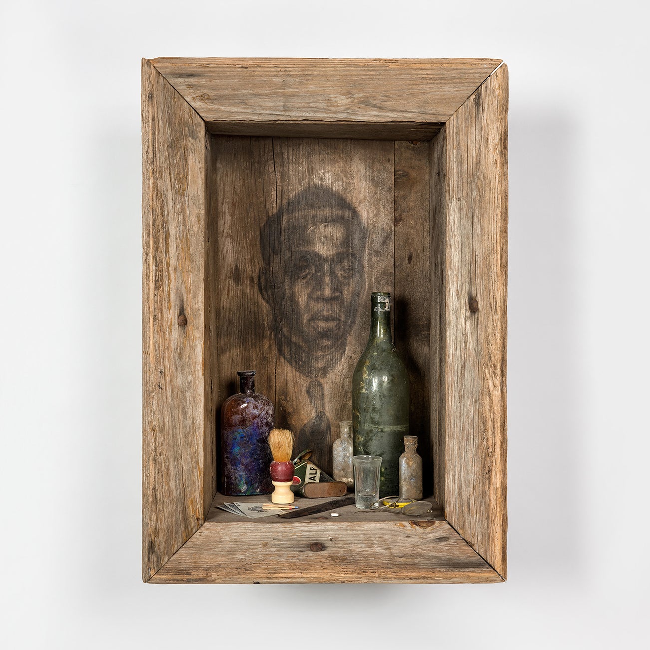 charcoal on wood, with found glass bottles, playing cards, wooden matches, metal tins, shot glass, eyeglasses, shaving brush, hair comb and aspirin