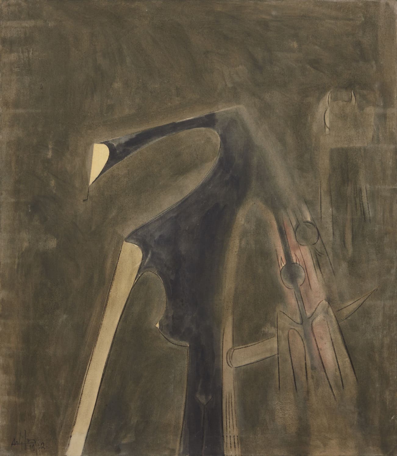 Midnight is an elegant example of Lam’s painting during this time and its slippages between figure and ground, syncretic and rhetorical bodies. A variation of the rarefied femme-cheval motif predominant in his work since the late 1940s, the central figure rises gracefully in space, her equine neck slender and seductive. Its arching, attenuated form is echoed in the spike that protrudes from her back and in the almost incorporeal tail that dissolves into an outlined form suggestive of the deity Eleggua, identified by his round head and horns; traces of his body hover to the right, his presence multiple and occult. A personification of ritual possession in the Afro-Cuban religion of Lucumí, or Santería, which Lam studied as a child with his godmother, the femme-cheval embodies the carnality of the feminine body and its transgressive prowess. Dimly luminous, Midnight evokes the darkness of the witching hour in velvety washes of pigment that envelop its subject, her figure receding into and out of the shadowy ground, within and beyond this world.