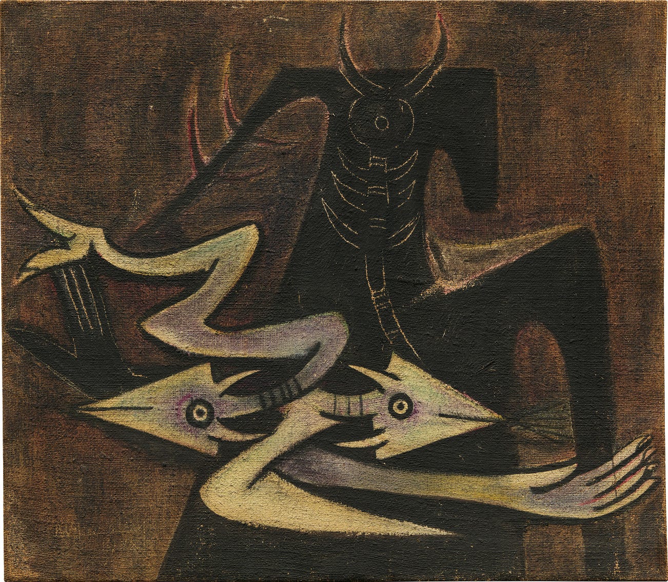 Guided by the knowledge that he had gained in Spain and France, and the invaluable experience shared on his trip back to Cuba, the works he created during his 8-year stay on the island constituted a significant body of work that launched a newly singular, mature, and enigmatic artist. The Warrior (Personnage avec lézard) belongs to the important body of work that the artist produced between 1942-1950, and which would come to define his oeuvre. In the painting, the artist utilizes distinctive Afro-Cuban symbolism, creating an atmosphere in which the human and the animal mix. Lam depicts a world of primitive myths, composed of figures with long arms and necks, spikey hands, well-formed eyes, mouths and horns, all evoking a haunting presence in the limited earthen palette of black and cream.