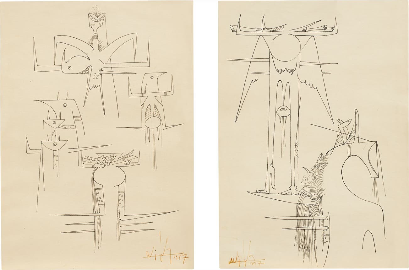 While studying in Spain, he met Pablo Picasso, who would become his mentor and friend as well as one of his great supporters, introducing him to the intelligentsia of the time. Lam significantly contributed to modernism during his prolific career as painter, printmaker, sculptor and ceramist. His works explored Cubism and expanded the inventive parameters of Surrealism while negotiating figuration and abstraction with a unique blend of Afro-Cuban and Surrealist iconography. His iconic visual language incorporated syncretic and fantastical objects and combined human-animal figures fused with lush vegetation.