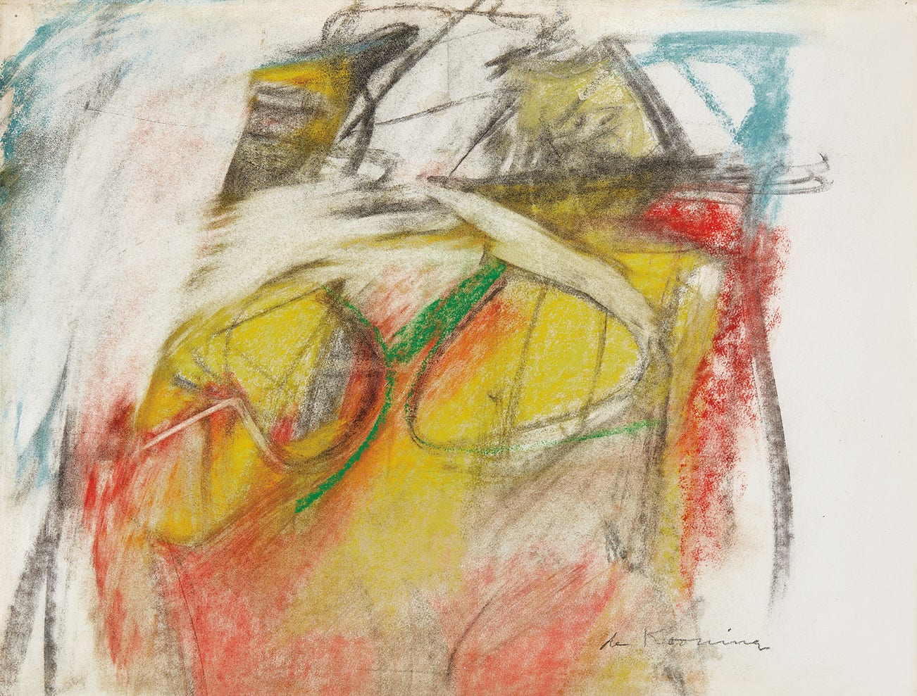 Executed in striking marks of colored pastel and graphite, Woman manifests all of the inimitable qualities that have garnered such renown and recognition for the series. In fact, the concept of the Woman had preoccupied de Kooning since the early 1940s, shortly after he met Elaine Fried, whom he would marry in 1943. However, there was a profound shift in his work between those early iterations and the eventual paramount pieces of the early 1950s. Namely, in the interim period de Kooning continued to refine and clarify his own modus operandi, focusing on all of the ways in which he was able to render the natural world around him in his unique style by incorporating expressive brushstrokes, line work, overlapping shapes reminiscent of collage, and the bold use of color.
