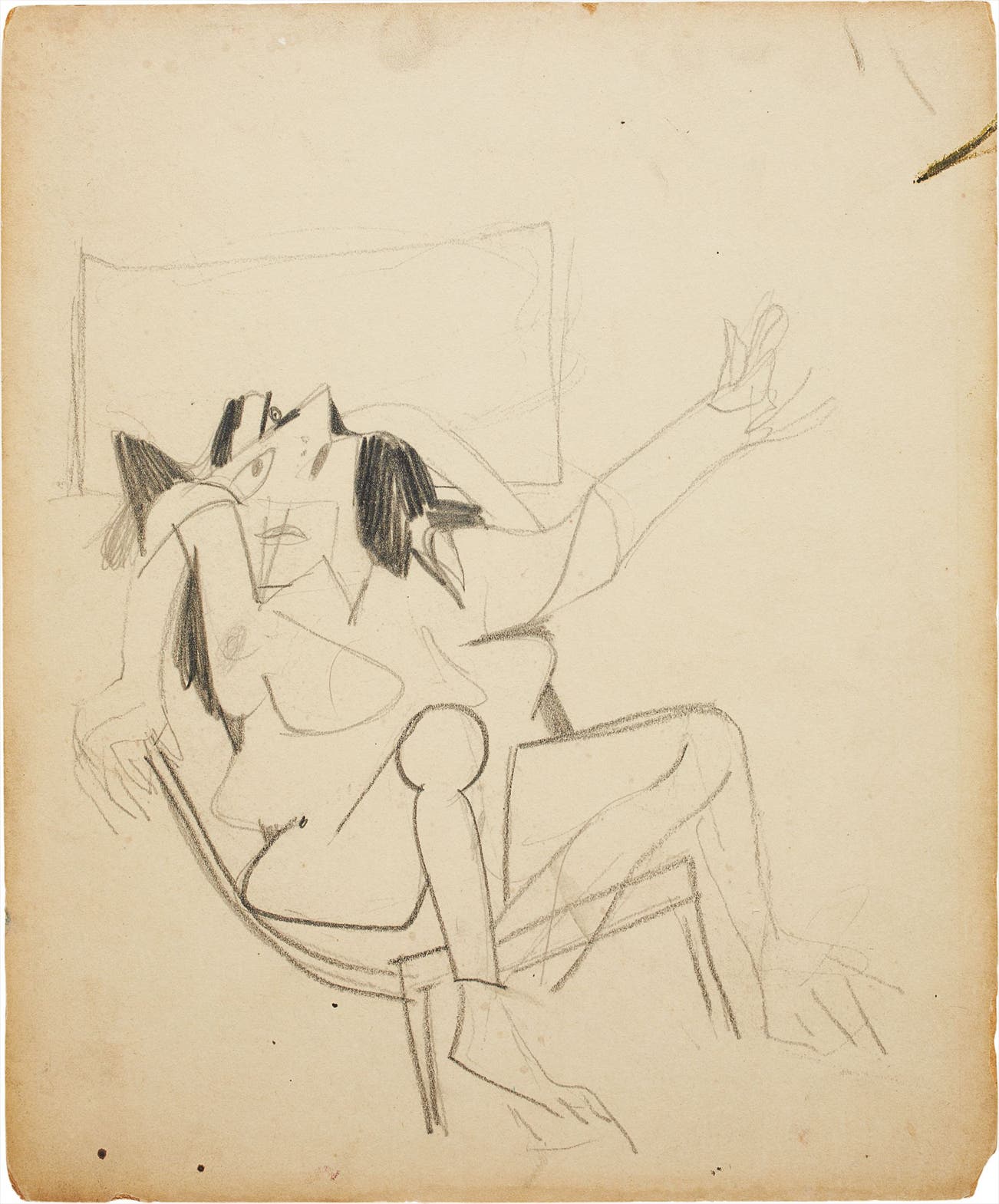 Yet de Kooning’s body of work was immature until he found his most prized subject. De Kooning had married Elaine Fried in 1938, and he began experimenting with her shape in the mid-1940s. De Kooning, intentionally or not, suddenly found himself hearkening back to the habits of the Impressionists in his work— portraying the female subject in a series of intimate poses. The present lot, Study for Seated Woman, 1946-1948, reveals a female subject reclining on a chair; her right arm is raised and curved behind her head, while her left arm stretches outwards. Her parted knees are each distinct, one angular and rigorously executed with thick black lines, while the left knee is barely rendered in wispy strokes.