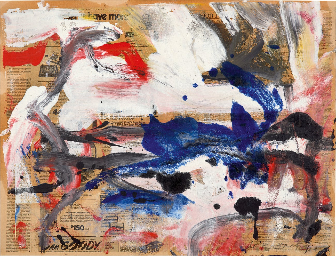 Untitled powerfully evidences how de Kooning continued his pioneering imprint technique in parallel to painting his abstracted landscapes. Expanding upon the newsprint technique he had integrated into his practice since the 1940s, de Kooning began exploring the aesthetic possibilities of what he termed “countertypes” in the mid 1960s. To create works such as Untitled, de Kooning would press large sheets of The New York Times and The Village Voice directly onto his freshly-painted canvases – intentionally creating subtle rippling effects before carefully peeling them off. Beyond their status as unmediated, intermediary records of de Kooning’s painting in progress, these works generate complex and compelling meanings of their own as the immediacy of de Kooning’s painterly gestures collide with the black and white printed words of the newsprint. A true painter of modern life, de Kooning puts forth a time capsule that seems to capture all the idiosyncrasies of the era – reminiscing on abstract art’s love affair with the intensity of urban life and capturing the increasing infiltration of mass media and popular culture into high culture.