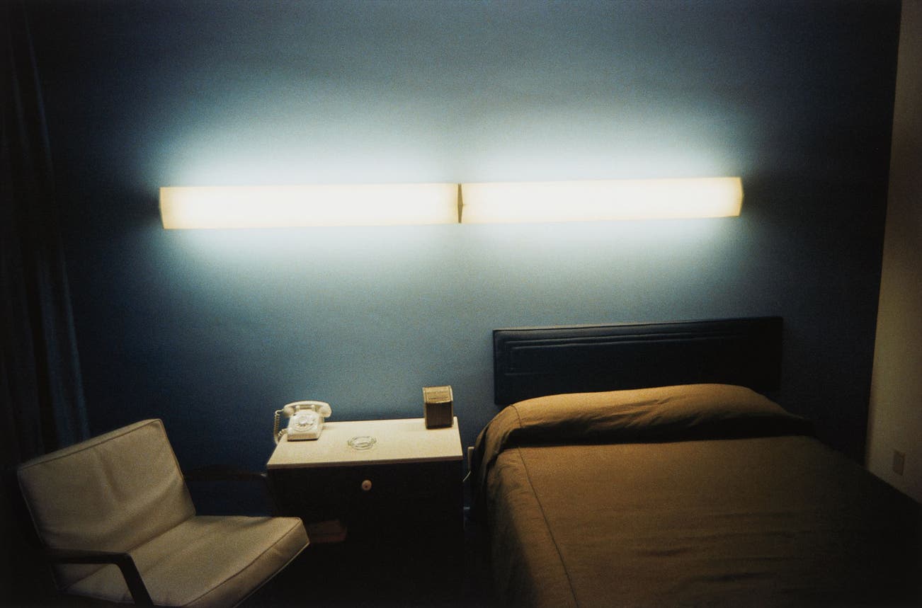 Eggleston’s observation of beauty captures unexpected moments in the everyday world surrounding him. In the present work, the contrast of the cold fluorescent light against the intense darkness of the motel room demonstrates Eggleston’s ability to create arresting compositions from unremarkable settings. This was one of 75 images, selected from over 2,000 negatives, that were published in the 2003 Los Alamos portfolio.