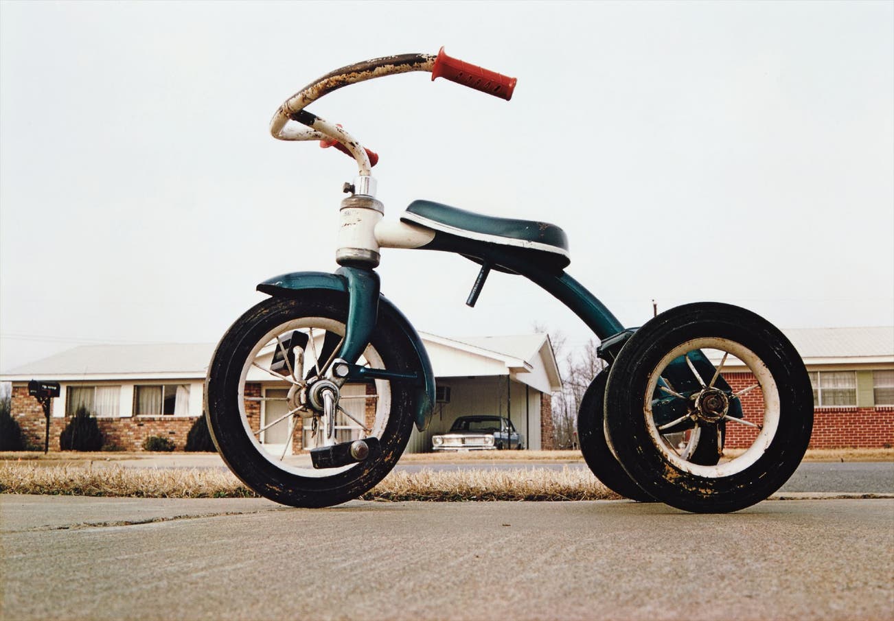 Once commenting on the photograph, Eggleston stated, “It was not so interesting to stand at normal standing-height and look down at this thing, so I got down low with it.” From this almost child-like point of view, the tricycle dominates the picture, with the complimentary colors of the blue-green frame, and bright cherry red handlebar, pushing the suburban Memphis setting to the background, leaving the viewer to contemplate the balance of color and form, and the transformation of the mundane into the monumental.