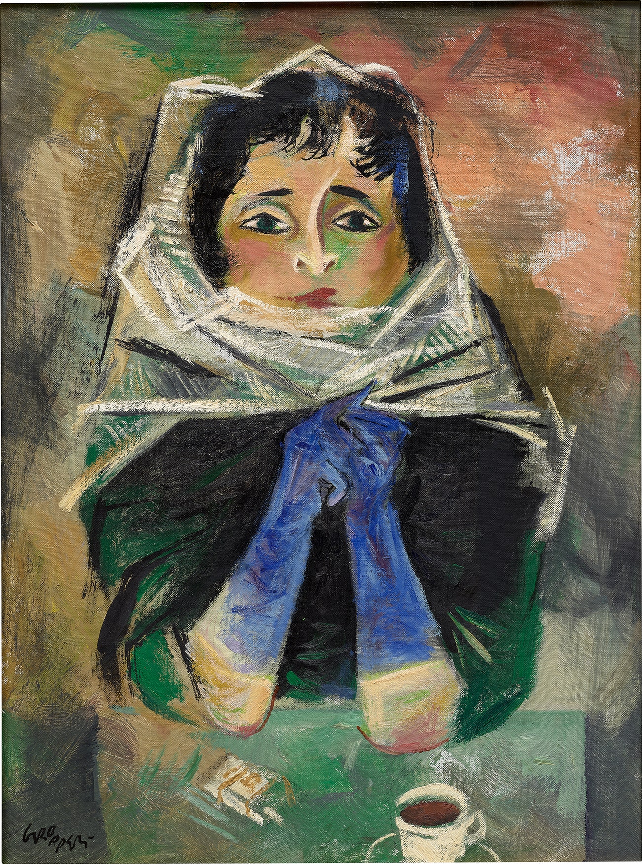 signed "GROPPER" lower left; titled and stamped "CUP OF TEA WILLIAM GROPPER CROTON-ON-HUDSON, N.Y." on the reverse of the backing board