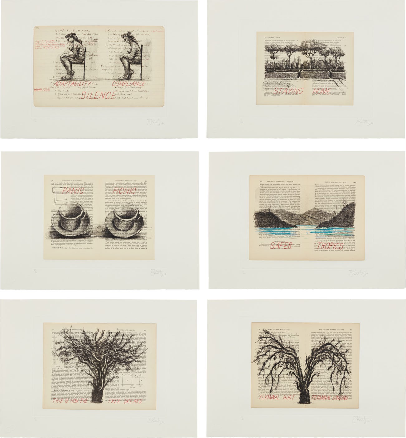 The complete set of six etchings and aquatint in colours, one with hand-colouring, on spreads from found books with Chine-collé to Fabriano Rosapina paper, with full margins.