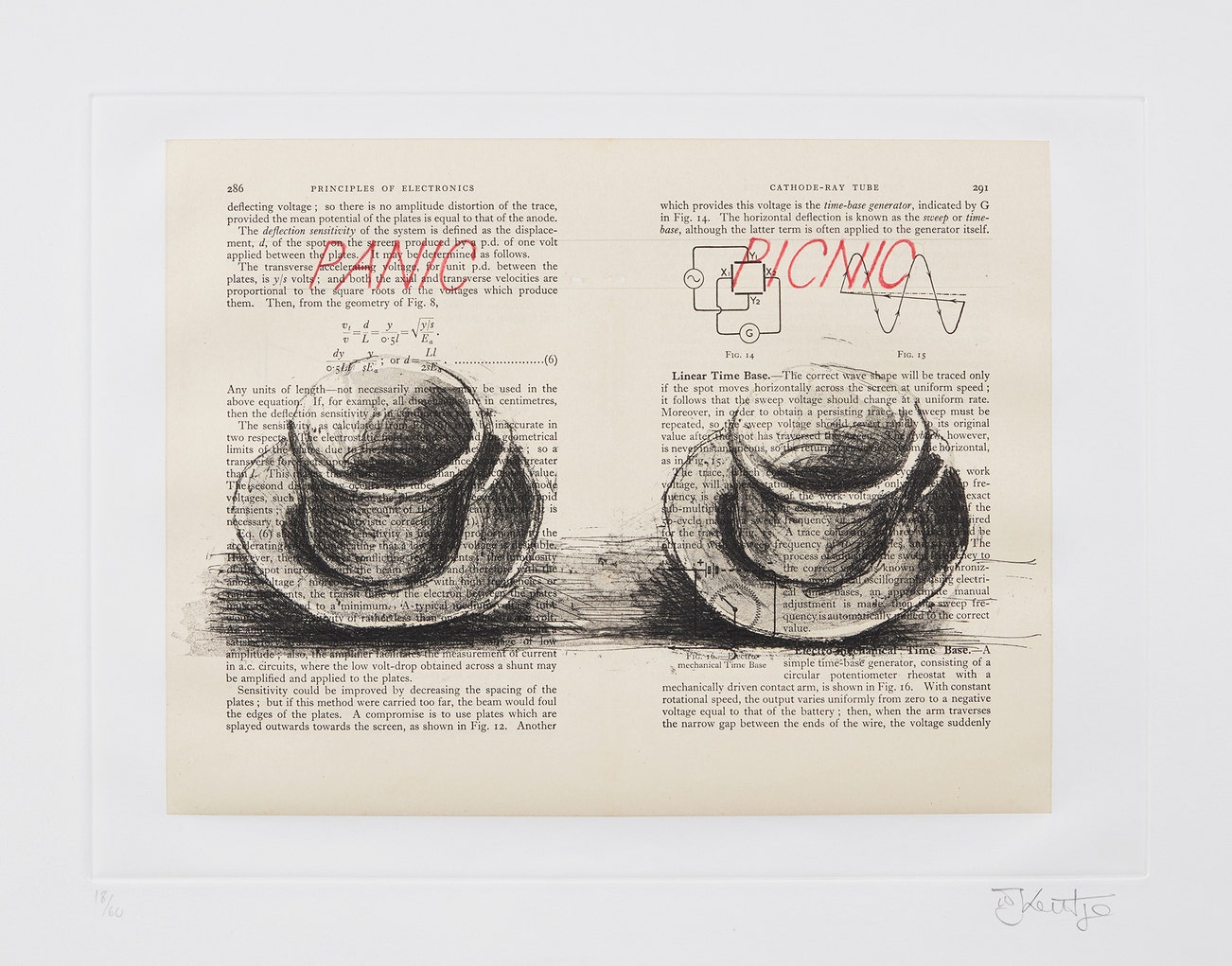 Etching and aquatint with hand-coloring in red pencil, on a found book spread Chine-collé to Fabriano Rosapina paper, with full margins