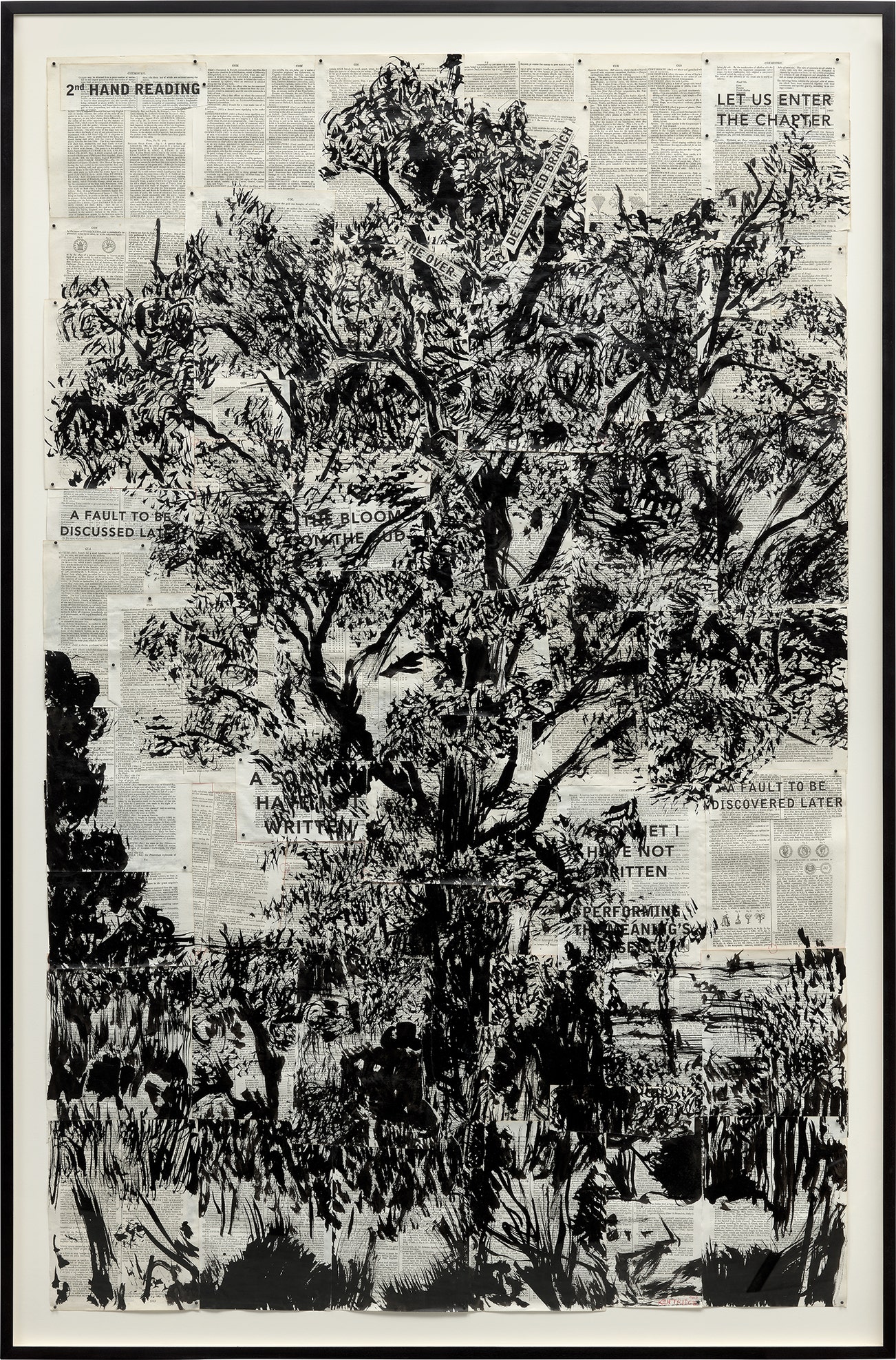 India ink, graphite and coloured pencil with sewing pins on ‘Universal technological dictionary pages’ paper collage on board, in artist's frame