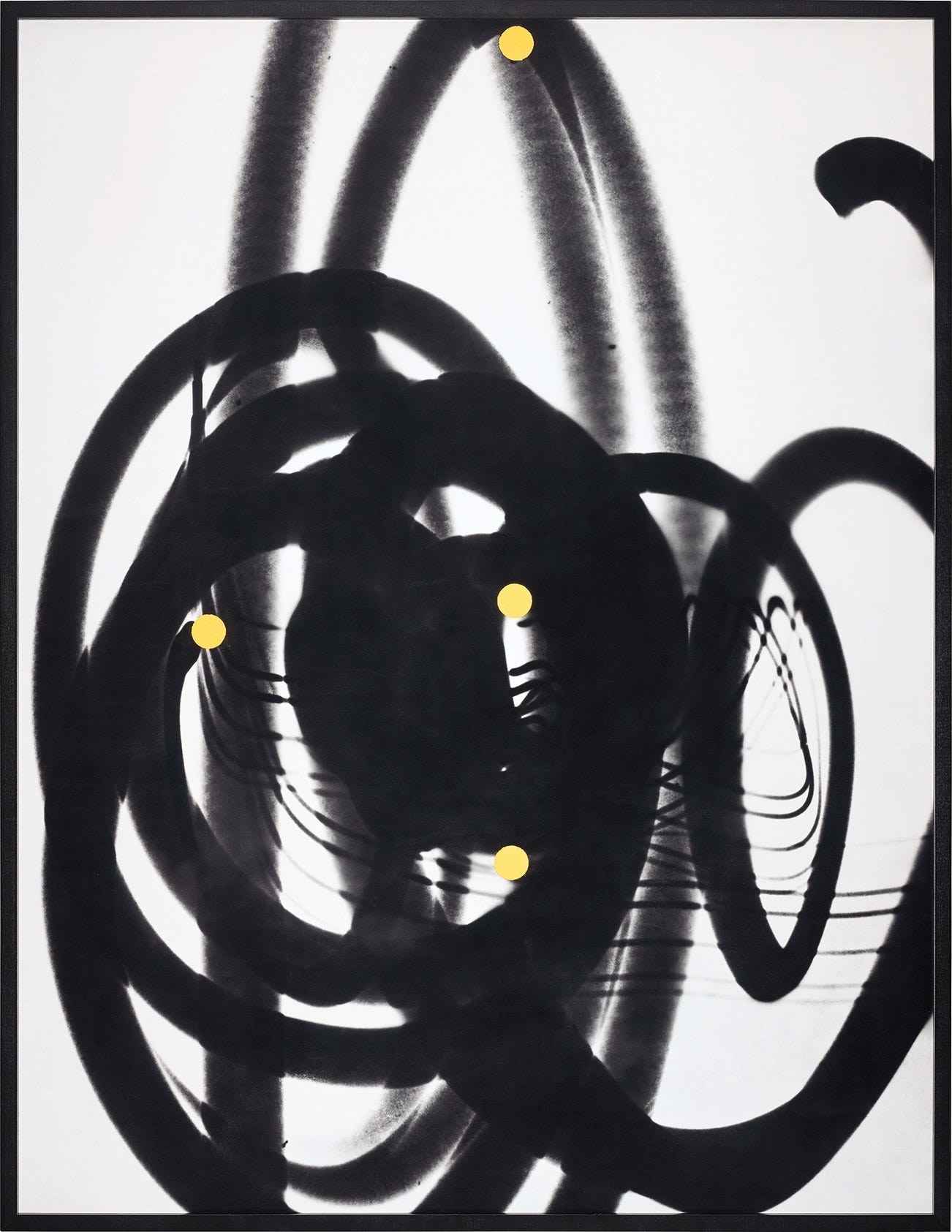 Seizing this opportunity, Klein set about creating works for a cover that was abstract yet entirely photographic – a marriage of graphic design and photography. In the darkroom, Klein would cut shapes out of paper then place the cut-out paper on the enlarger. He would then transmit light through the cut outs and by moving the paper around 'paint' directly onto the photosensitive paper. After he had developed the print, he would continue cutting out shapes of coloured paper and affixing them to the work, culminating in a collage that he would finally shoot with his camera. The resulting photograph is what he considered the final artwork. In the present lot, we see Klein’s flowing black ‘traces’, created photographically, interrupted by four yellow circles. Filling and expanding off the edge of the frame, these ‘traces’ push the boundaries of photography and reveal its ability to depict non-representational matter.