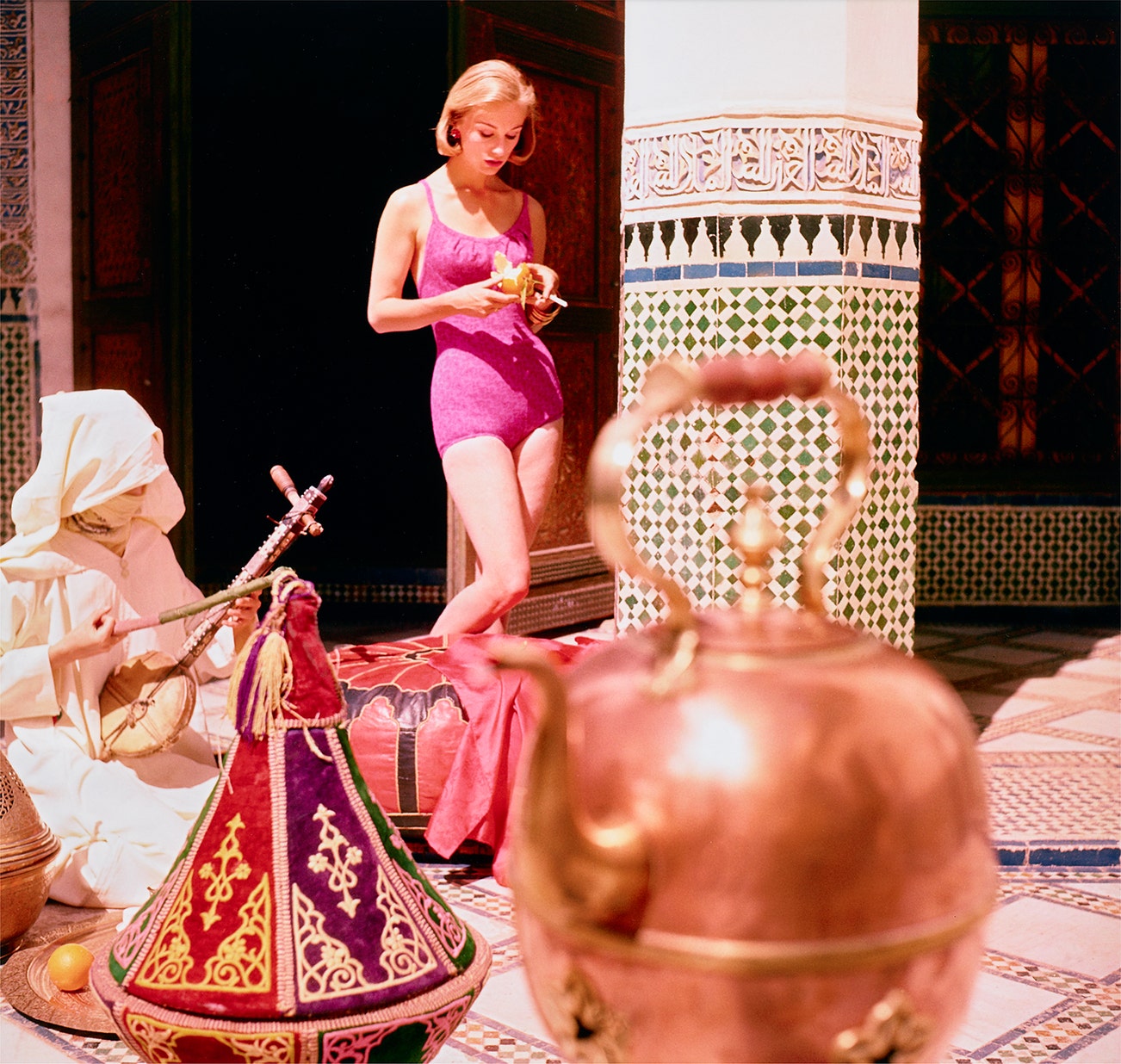 Pink Maillot + Kettle + Guembri Musician in Courtyard, Morocco