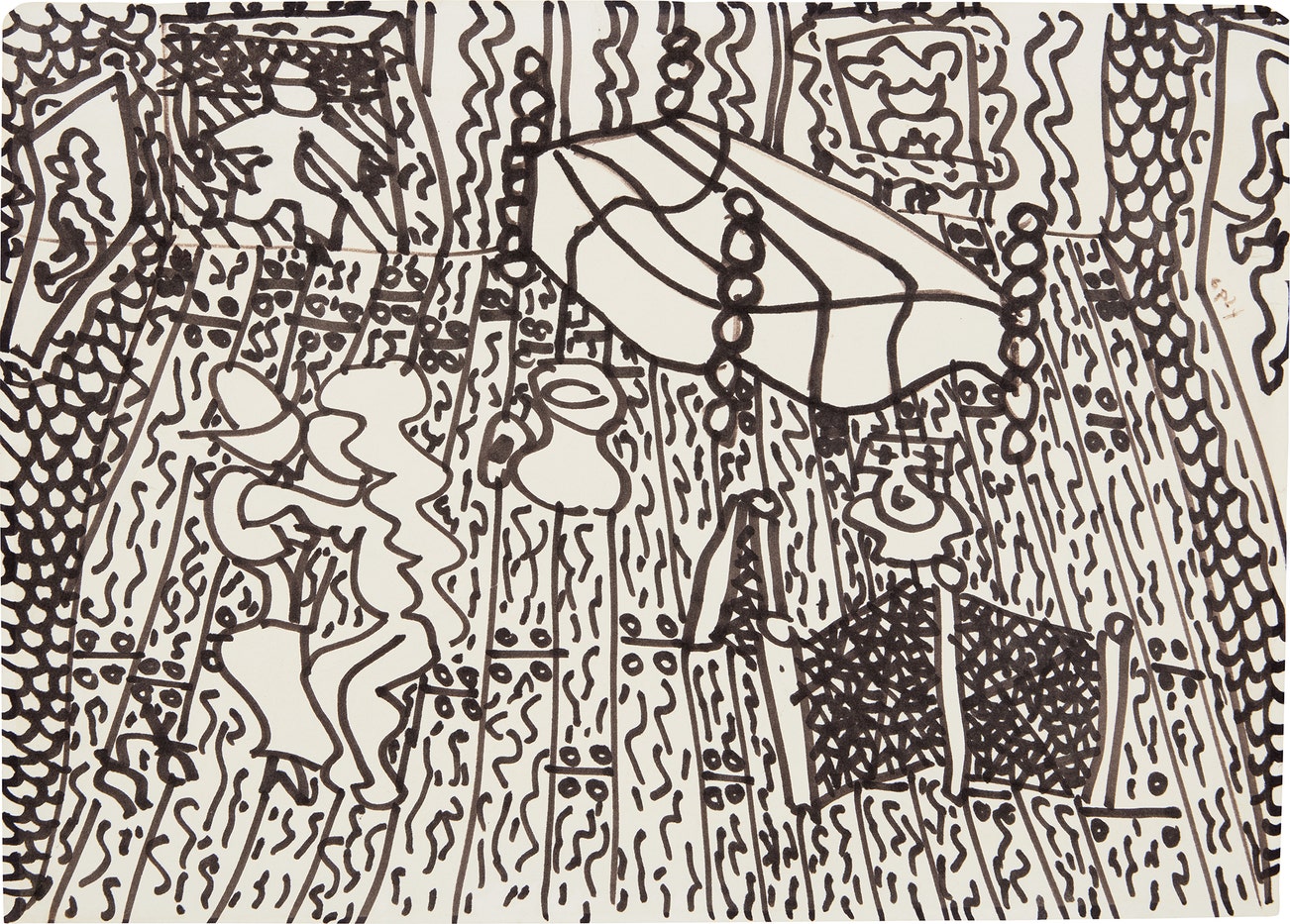 Unique black marker drawing, on wove paper.