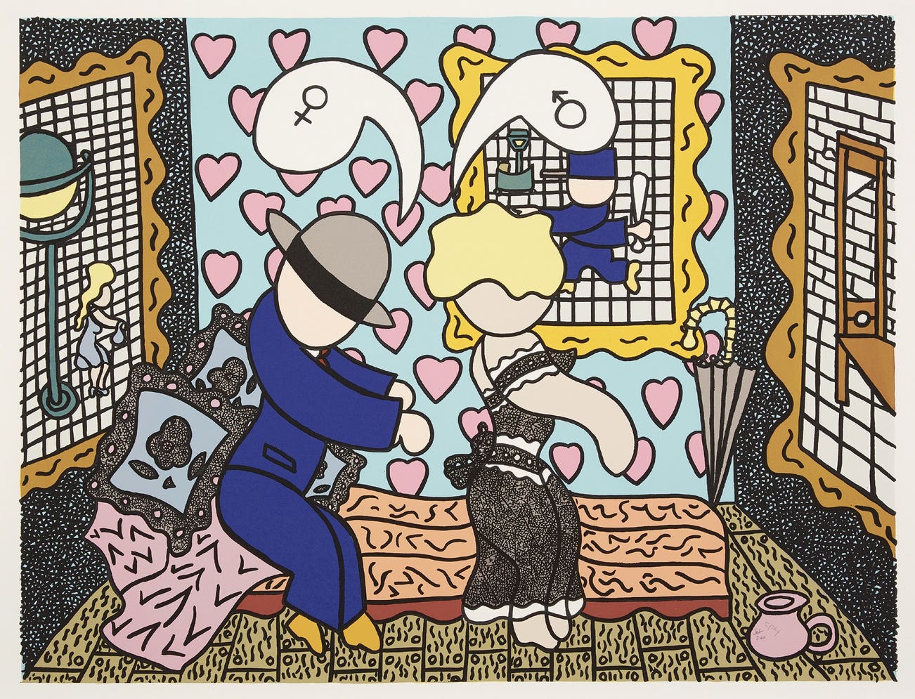 William N. Copley, also known by the name of CPLY, drew attention to himself in the late 1940s by fusing elements of Surrealism and Pop Art.  Copley focused on symbols of American pop culture—staples of American society including pin-up girls, cowboys and the flag—and transformed them into more accessible, universal icons that could appeal to both men and women without bias.