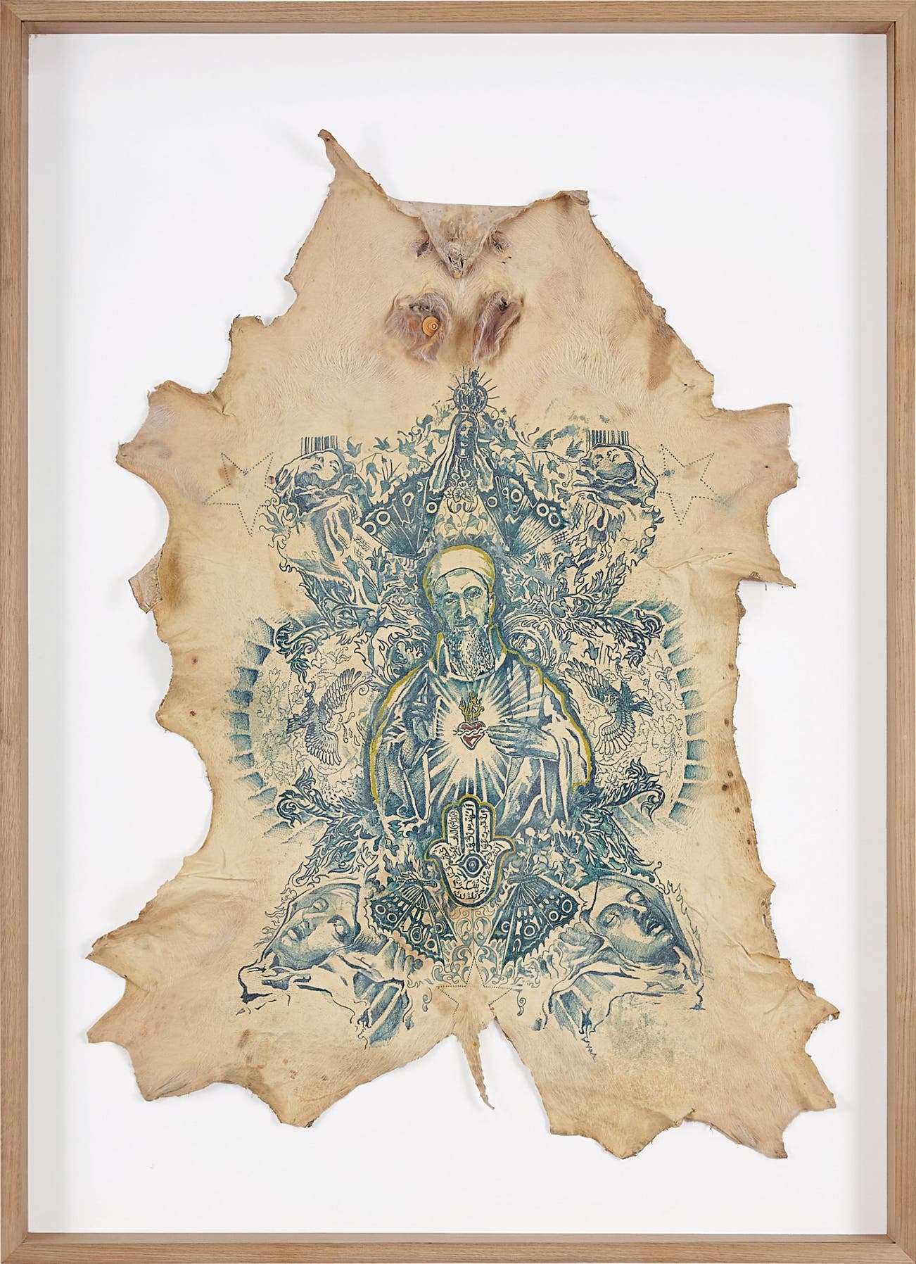 The present lot is of unusual nature – an image of Bin Laden, largely in dark blue ink, almost resembling a biro, spreads over the skin of the back and legs of a pig. It shocks the viewer on many levels – the pink colouring of the skin together with its fair hairs creates the first impression of a human skin being displayed; another shock comes from the insult of connecting Bin Laden, Christian & Muslim icons, such as Bernini’s Saint Teresa in ecstasy, irreverently entangled with Fatima’s hand, the whole tattooed on the skin of a pork, a forbidden animal in both Muslim and Judaic cultures.