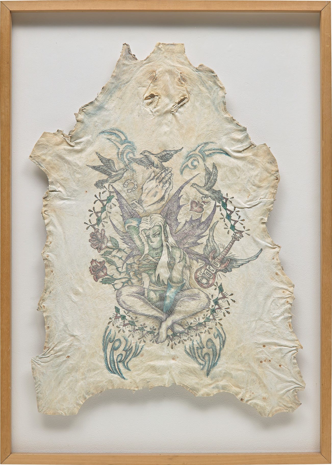 tattooed pig skin, in artist's frame
