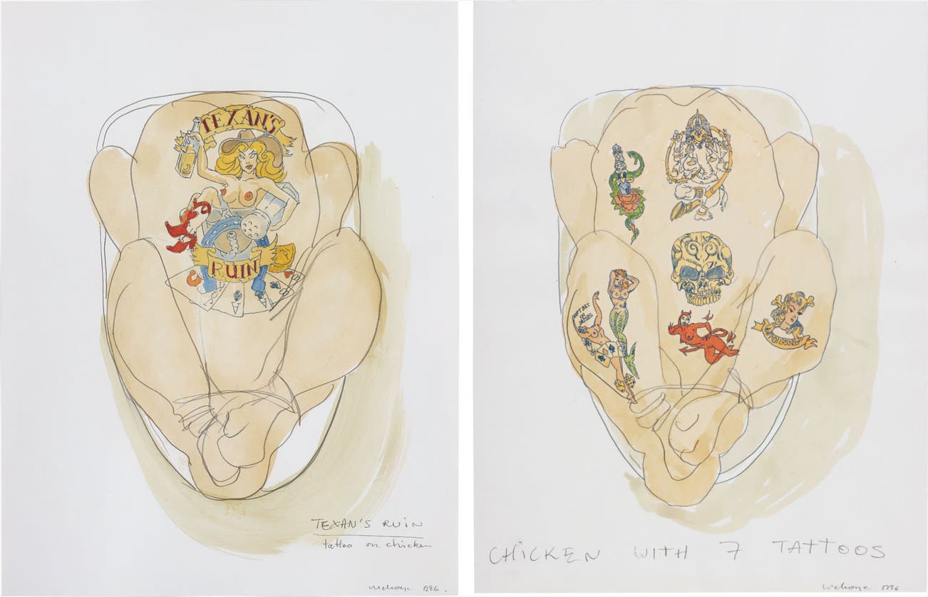 (ii) Signed, titled and dated 'CHICKEN WITH 7 TATTOOS WDelvoye 1996' lower centre and lower right.