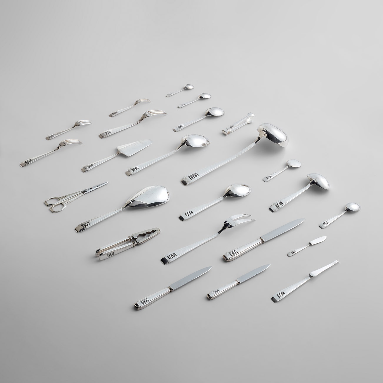 Manufactured by Wolfers Frères, Brussels, Belgium. Reverse of each handle impressed with LS monogram. Each piece excluding grape scissors impressed with fineness mark A835 and silversmith's mark. Blades of each dinner knife, dessert knife, fruit knife and grape scissors impressed INOXYDABLE. Comprising 12 dinner forks, knives and spoons, 12 lobster forks, 12 dessert forks, knives and spoons, 12 fruit forks and knives, 12 pastry forks, 12 teaspoons, coffee spoons, mocha spoons and ice cream spoons, 2 butter knives, and 12 service pieces (182).