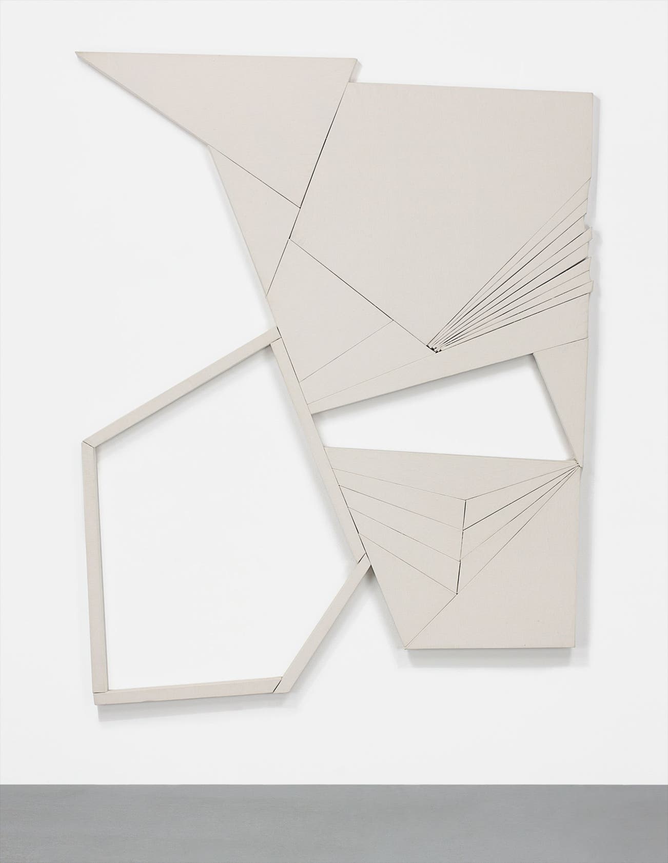 Sideways creates illusions in the suggestion of dimensional manipulation and potential distortion. The various parts exist both individually and in dynamic relation to one another to shape an ambiguous yet comprehensive whole. The modernist forms avoid conformist limitations but also challenge the harsh physicality typical of Stella’s works. Kahn has managed to integrate fragility into the concept of spatial abstraction. The imposed lines fan out and converge across the piece in a manner that implies the human ribcage and highlights the corporeal and delicate elements in an otherwise strongly structural piece.