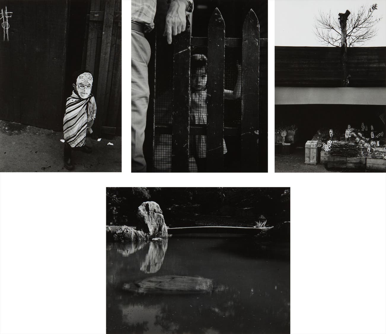 Titles include: (i) Japanese child wearing striped cloth with mask and spectacles, 1949 (ii) Little girl looking through fence by which a man is standing, 1948 (iii) Japanese food market, 1948 (iv) Stone bridge of Amanohashidate from Katsura, 1948