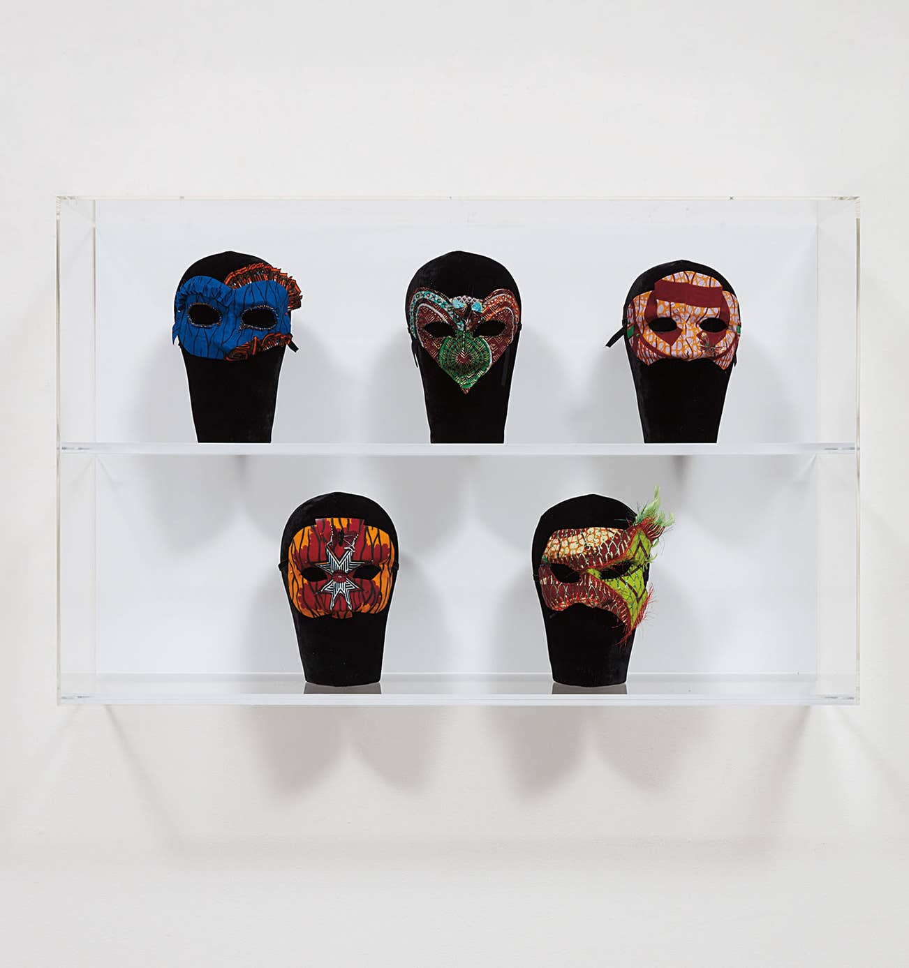 fabric masks, velvet on wood and metal mold, velvet head covers, in 5 parts, all in artist's Plexiglas case