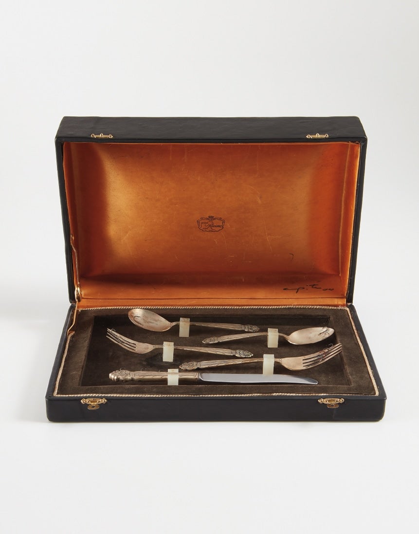 silver place setting with fish hooks, in leather case, in 6 parts