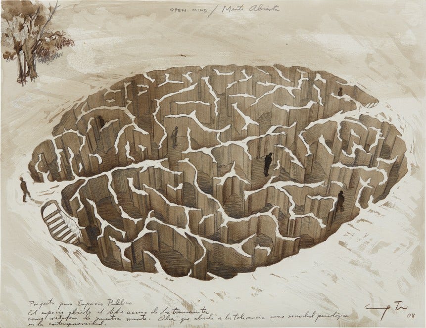 signed and dated "Capote 08" lower right; further titled "Open Mind / Mente Abierta" upper edge; further inscribed "Proyecto para Espacio Publico El espacio abierto al libre acceso de los transeuntes como metafora de nuestra mente. Obra que alude a la tolerancia como necesidad psicológica en la contemporaneidad [Open space made accessible to pedestrians as a metaphor of our mind. A work that alludes to tolerance as a psychological need in contemporaneity]" lower edge