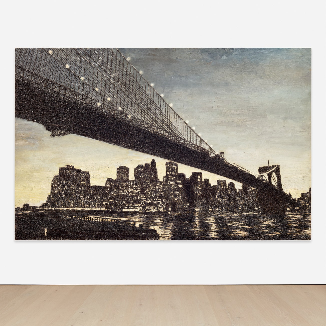 oil, fish hooks, nails and canvas on plywood