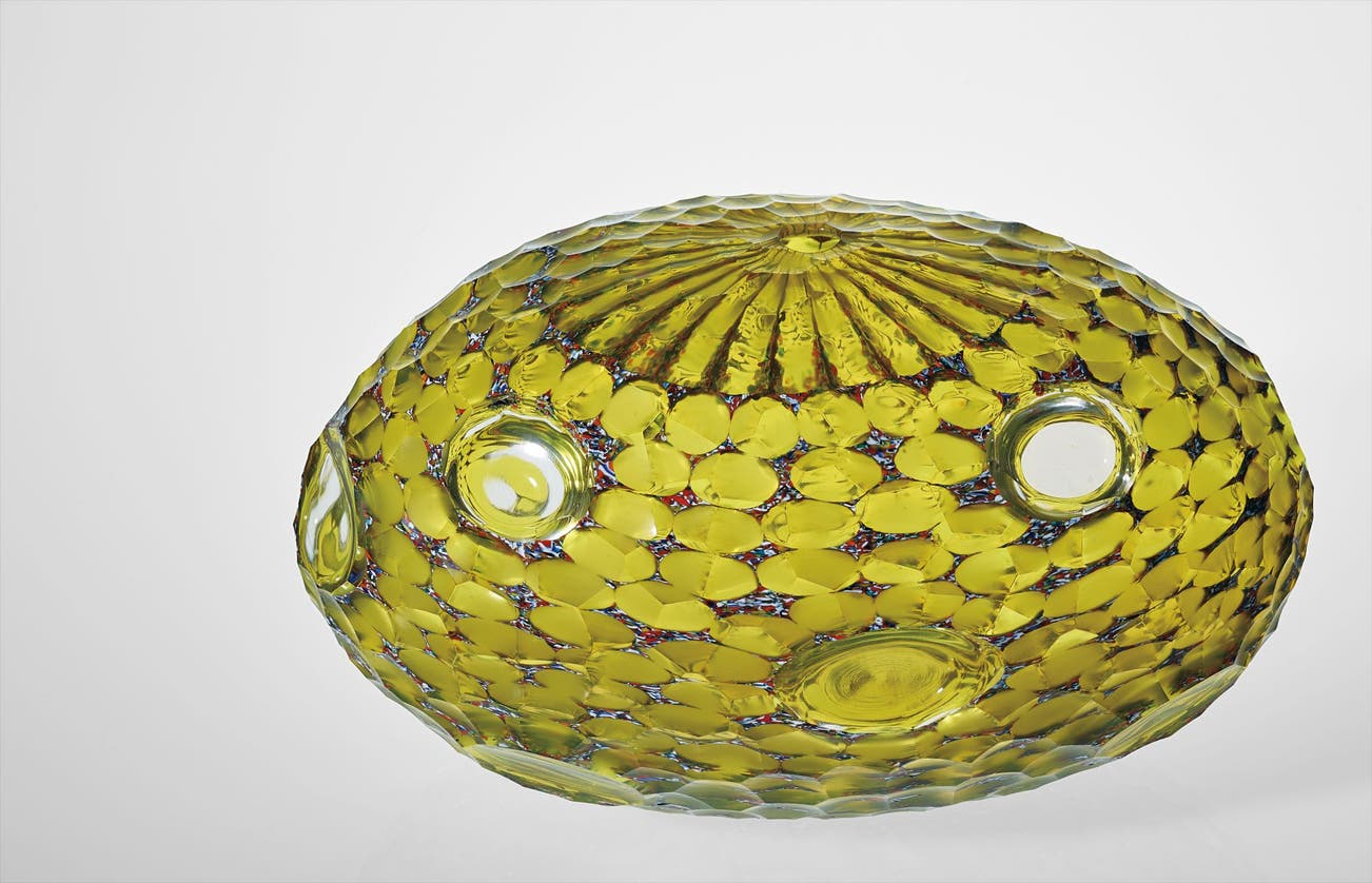 Yoichi Ohira started his career as a freelance artist in 1991. He created exquisite and unique pieces by using the mosaic glass technique called murrina, an ancient technique dating from the II millennium BC, and then further developed by the Alexandrine and Roman glass blowers. Ohira selected the composition of polychrome glass tesserae, which, once fused by the heat of the furnace, was handed over to a trusted glass master, who picked it up with the blowpipe and modelled it. The grinding process would then be completed by the master engraver. Ohira would be present throughout the whole process to make sure that every minute detail would correspond to his original design.