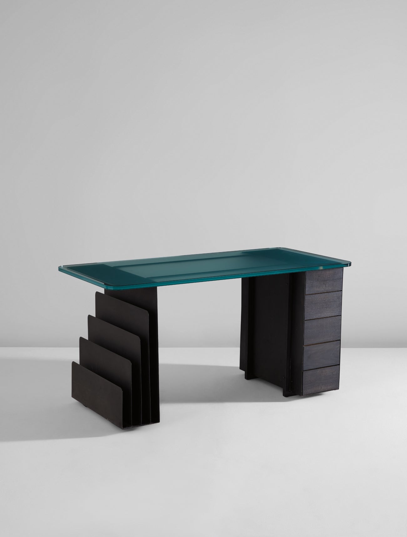Painted steel, painted oak, glass.